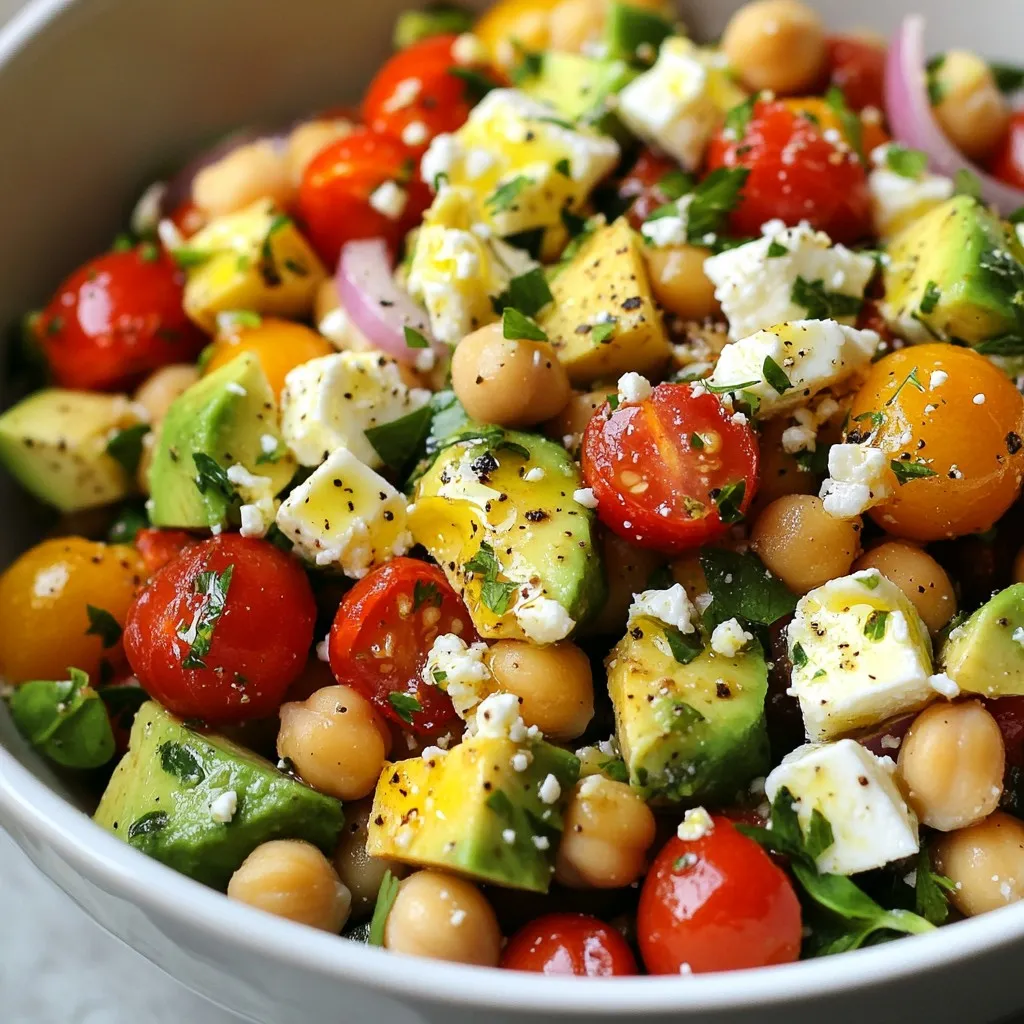 To make the Chickpea Feta Avocado Salad, gather these simple ingredients: - 1 can (15 oz) chickpeas, thoroughly rinsed and drained - 1 large avocado, carefully diced - 1 cup cherry tomatoes, halved - 1/2 cup feta cheese, crumbled - 1/4 red onion, finely chopped - 1/4 cup fresh parsley, chopped - 2 tablespoons extra virgin olive oil - 1 tablespoon freshly squeezed lemon juice - Salt and pepper, to taste - 1 extra avocado, diced (for garnish) Fresh ingredients make this salad stand out. Avocado adds creaminess and good fats. Cherry tomatoes bring sweetness and color. Red onion gives a nice crunch and sharpness. Fresh parsley adds a burst of flavor and makes the dish look pretty. Using quality extra virgin olive oil boosts richness. Fresh lemon juice adds a zesty kick. This salad is perfect for many diets. It is vegetarian and gluten-free. Chickpeas provide protein and fiber. Feta cheese adds calcium and flavor. You can easily replace feta with vegan options to make it plant-based. This salad works for lunch, dinner, or a snack, making it a great choice for everyone. {{ingredient_image_2}} Start by rinsing and draining one can of chickpeas. This helps remove any extra salt. Then, take your large avocado and carefully dice it. Use a sharp knife for clean cuts. Next, halve the cherry tomatoes and place them in your bowl for color. Crumble feta cheese over the mixture for a creamy texture. Lastly, finely chop a quarter of a red onion and add it to the bowl. In a small bowl, whisk two tablespoons of extra virgin olive oil with one tablespoon of lemon juice. This dressing adds brightness to the salad. Season it with salt and pepper. Pour this dressing over the salad ingredients in the large bowl. Gently toss everything together with a spatula. Be careful not to mash the avocado. You want to keep those nice chunks intact for the best flavor and look. To ensure your salad stays fresh, use ripe avocados. A ripe avocado will yield slightly when pressed. Combine the salad right before serving to keep the ingredients crisp. If you make it ahead, store the dressing separately. Add it just before serving to avoid sogginess. Finally, sprinkle fresh parsley over the salad right before serving for a burst of flavor and color. To ripen avocados, place them in a paper bag. The bag traps ethylene gas, speeding up ripening. You can add a banana or apple for extra help. Check daily until they feel soft. This usually takes 2 to 5 days. For quick ripening, place them near a warm spot, like a sunny window. You can boost your salad with fresh herbs. Basil, mint, or cilantro work well. Try adding a pinch of cumin or paprika for warmth. If you like a kick, diced jalapeños are great. For crunch, toss in some nuts or seeds, like toasted pumpkin seeds. These changes make the dish more exciting and unique. Serve the salad in bright bowls for a fun touch. Garnish with extra diced avocado and crumbled feta on top. A sprig of parsley adds color and a fresh smell. You can also drizzle a little more olive oil for shine. This makes the salad look as good as it tastes. Pro Tips Use ripe avocados: Ensure your avocados are perfectly ripe for the creamiest texture and best flavor in the salad. Adjust seasoning to taste: Always taste your salad before serving and adjust the salt and pepper to enhance the flavors. Add a protein boost: Consider adding grilled chicken or shrimp for a more filling meal option that pairs well with the salad. Chill before serving: Let the salad chill in the refrigerator for about 30 minutes to allow the flavors to meld together beautifully. {{image_4}} You can switch up the chickpeas with other beans. Black beans or kidney beans work great. They add color and flavor. Try adding different cheeses, too. Goat cheese gives a tangy taste, while mozzarella offers a milder flavor. Each choice brings a new twist to the salad. Using seasonal veggies makes this salad even better. In spring, add peas for a sweet crunch. In summer, crisp bell peppers can brighten the dish. In fall, roasted butternut squash adds warmth and depth. Each season brings fresh flavors, so don’t hesitate to mix things up. If you want a vegan option, swap feta for tofu or vegan cheese. Crumbled tofu can give a similar texture. You can also use nutritional yeast for a cheesy flavor. This keeps the salad creamy and delicious, while sticking to plant-based choices. To keep your Chickpea Feta Avocado Salad fresh, store it in an airtight container. This prevents air from making it soggy. It’s best to eat leftovers within two days. The avocado may brown, but you can still enjoy the flavor. For the best taste, buy fresh ingredients. Use ripe avocados for creaminess. Store them at room temperature until they ripen. Once ripe, keep them in the fridge. Cherry tomatoes should stay on the counter to keep their flavor. For feta, keep it in its brine or in a covered container. This salad is best enjoyed cold, so reheating isn't ideal. If you want to repurpose leftovers, use them as a filling for a wrap or mix them into a grain bowl. You can also add them to a quesadilla for a tasty twist. Yes, you can make this salad ahead of time. It keeps well in the fridge for up to three days. However, the avocado may brown. To keep it fresh, add the avocado just before serving. This way, it stays green and tasty. Chickpeas are great for you! They are high in protein and fiber. This helps you feel full longer. They also contain vitamins and minerals like iron and magnesium. Eating chickpeas can support heart health and aid digestion. Plus, they are low in fat, making them a smart choice. To make this salad lower in calories, use less feta cheese. You can also skip the olive oil or use less. Adding more vegetables like cucumber or bell peppers can help, too. These changes keep the salad light while still being delicious. In this post, I covered how to create a delicious salad using fresh ingredients. We explored ingredient lists, step-by-step preparation, and tips
