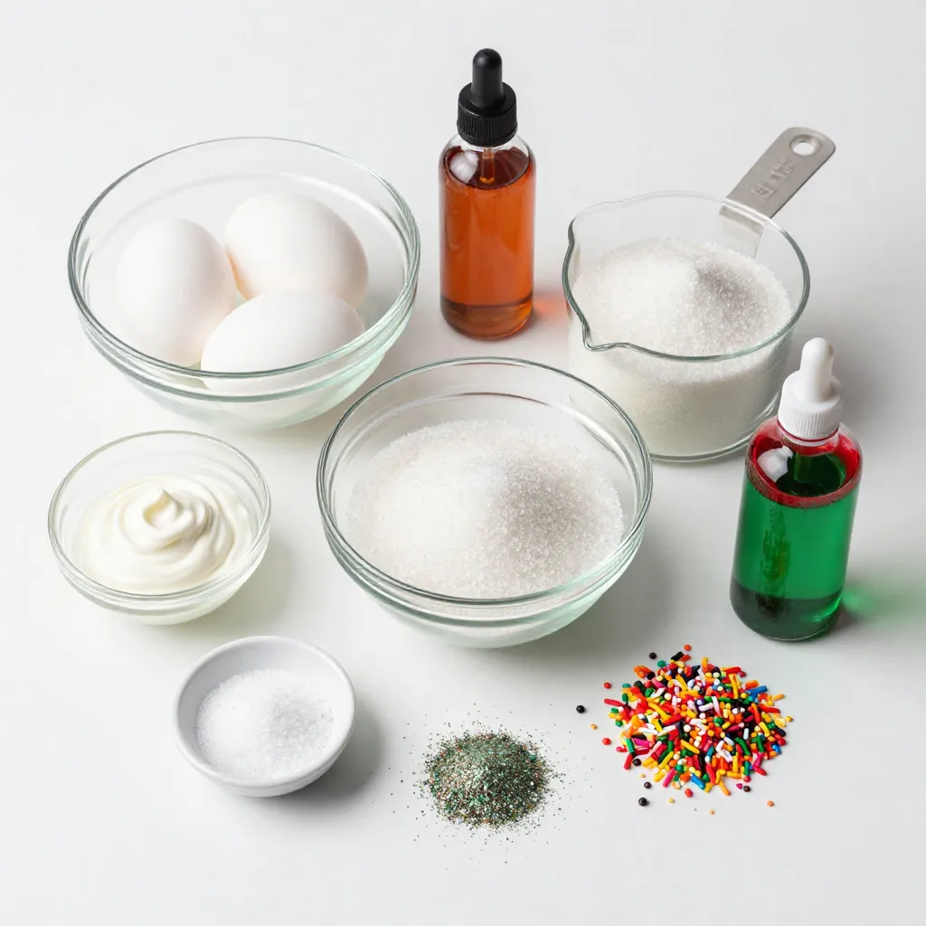 This list will help you get ready for a fun, festive kitchen adventure. Each ingredient plays a part in making your meringue kisses light and sweet.