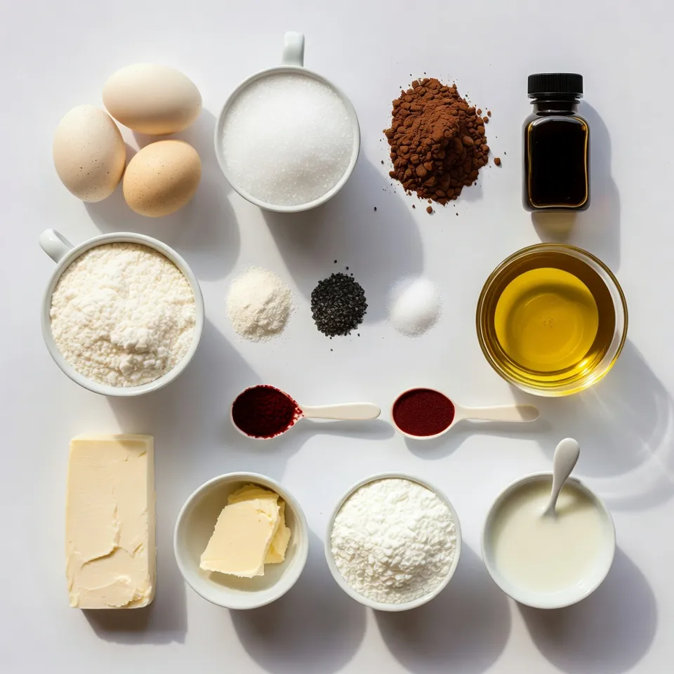 For the dry ingredients, you need flour, baking powder, salt, and baking soda. These help your cake rise and create a soft texture. The vegetable oil keeps the cake moist, and the red food coloring gives it that festive look. Finally, a dusting of powdered sugar adds a lovely finish.
