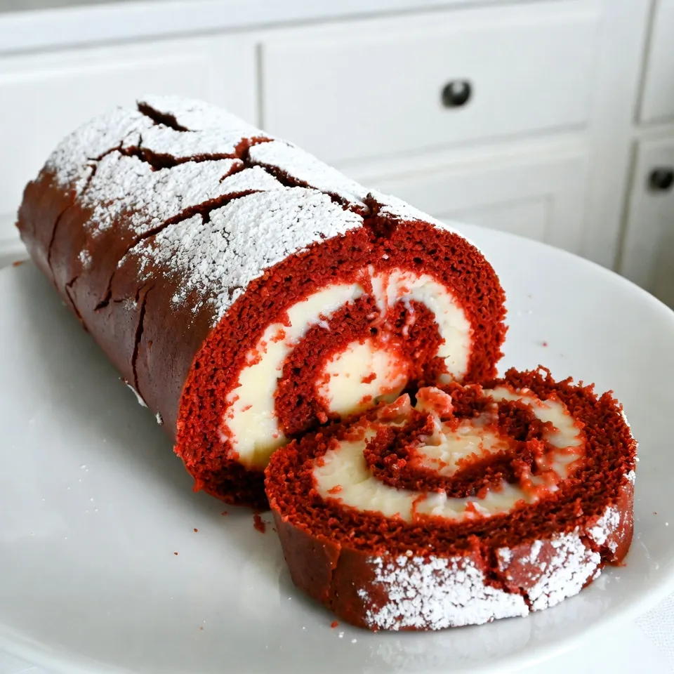 - 3 large eggs - 1 cup granulated sugar - 1 tablespoon unsweetened cocoa powder - 1 teaspoon vanilla extract - 1 cup all-purpose flour - 1 teaspoon baking powder - ½ teaspoon salt - ½ teaspoon baking soda - 1 cup vegetable oil - 2 tablespoons red food coloring - Powdered sugar for dusting - 8 oz cream cheese, softened to room temperature - ½ cup unsalted butter, softened to room temperature - 2 cups powdered sugar - 1 teaspoon vanilla extract - 1 tablespoon heavy cream (or milk) The ingredients for this Christmas Red Velvet Cake Roll are simple yet delightful. You start with three large eggs, which provide the base. They add fluffiness and richness. Next, you mix in granulated sugar to sweeten it up. The cocoa powder adds a hint of chocolate flavor, while vanilla extract gives it a warm aroma. For the dry ingredients, you need flour, baking powder, salt, and baking soda. These help your cake rise and create a soft texture. The vegetable oil keeps the cake moist, and the red food coloring gives it that festive look. Finally, a dusting of powdered sugar adds a lovely finish. Moving on to the cream cheese filling, you will need softened cream cheese and butter. They create a rich, creamy texture. The powdered sugar sweetens the filling, while vanilla extract adds depth. A splash of heavy cream (or milk) helps make it smooth and spreadable. These ingredients come together to create a stunning dessert, perfect for any holiday table. {{ingredient_image_2}} - Preheat the oven to 350°F (175°C). - Prepare a 15x10 inch jelly roll pan by lining it with parchment paper. - In a large bowl, beat 3 large eggs and 1 cup of granulated sugar until fluffy. - Add 1 tablespoon of unsweetened cocoa powder and 1 teaspoon of vanilla extract. - In another bowl, whisk 1 cup of all-purpose flour with 1 teaspoon of baking powder, ½ teaspoon of salt, and ½ teaspoon of baking soda. - Slowly mix the dry ingredients into the egg mixture. Add 1 cup of vegetable oil and 2 tablespoons of red food coloring. Mix until smooth. - Pour the vibrant batter into the prepared pan. Spread it evenly. - Bake for 12-15 minutes. Check with a toothpick; it should come out clean. - Dust the top with powdered sugar. Cover the cake with a clean kitchen towel. Flip the pan onto the towel and peel off the parchment paper. Roll the cake tightly using the towel. Let it cool completely. - In a bowl, beat 8 oz of softened cream cheese, ½ cup of unsalted butter, and 2 cups of powdered sugar until smooth. - Add 1 teaspoon of vanilla extract and 1 tablespoon of heavy cream. Mix until fluffy. - Once the cake is cool, unroll it gently. Spread the cream cheese filling evenly over the cake. - Roll the cake back up without the towel. Wrap it in plastic wrap and chill it in the fridge for at least 1 hour. - After chilling, slice the cake roll into rounds and serve. Enjoy this festive treat! Rolling your cake while it's warm is key. If you wait too long, it may crack. The warmth helps the cake stay flexible. Use a clean kitchen towel to help with the rolling process. A light dusting of powdered sugar on the cake's surface prevents sticking. This simple step makes a big difference. You can add fun flavors to your cream cheese filling. Try lemon for a zesty touch or almond for a nutty twist. If you want a healthier option, swap out some sugar for honey or agave. This keeps the filling tasty and lowers the sweetness. Experimenting with flavors can make the cake even more special. Arranging your cake slices on a beautiful platter is important. This makes the dessert look more inviting. You can garnish with fresh berries or mint leaves for color. A sprinkle of powdered sugar on top gives a lovely finishing touch. These small details make your dessert shine at the holiday table. Pro Tips Fresh Ingredients: Always use fresh eggs and cream cheese for the best flavor and texture in your cake roll. Food Coloring: For a more vibrant red, consider using gel food coloring instead of liquid. It provides a richer hue without adding extra moisture. Cooling Technique: When rolling the cake, ensure it cools completely in the towel to maintain its shape and prevent cracking. Chill Before Serving: Let the filled cake roll chill for at least an hour; this helps the flavors meld and makes slicing easier. {{image_4}} You can switch up the red velvet flavor for fun! Try making a chocolate red velvet cake roll. Just add more cocoa powder to the batter. This gives a deep, rich chocolate taste that pairs well with cream cheese. Another option is a carrot cake roll. For this, mix in grated carrots and warm spices like cinnamon and nutmeg. It adds a nice twist and brings in some holiday spice. If you want to change the filling, consider using fruit preserves or curds. Strawberry or raspberry preserves add a fruity kick. They bring brightness and a fresh taste to the cake. Whipped cream is another great choice. You can fold in some vanilla or lemon zest to make it flavorful. This adds a light and airy feel to the dessert. Decorating your cake roll can be fun! Use holiday-themed toppings like crushed peppermint or chocolate shavings. They create a festive look and enhance the taste. You can also add edible decorations like sprinkles or berries. These little touches make your cake roll stand out during Christmas festivities. Enjoy getting creative with your festive dessert! To keep your Christmas Red Velvet Cake Roll fresh, wrap it well in plastic wrap. Make sure it’s airtight. You can also place it in a sealed container. This method helps keep the cake moist. Refrigerate it for up to three days. For the best taste, chill the cake for at least one hour before serving. This resting time allows the flavors to blend perfectly. For long-term storage, freezing is a great option. Slice the cake roll into pieces before freezing. Wrap each slice in plastic wrap, then place them in a freezer bag. This helps prevent freezer burn. You can freeze the cake for up to three months. When read
