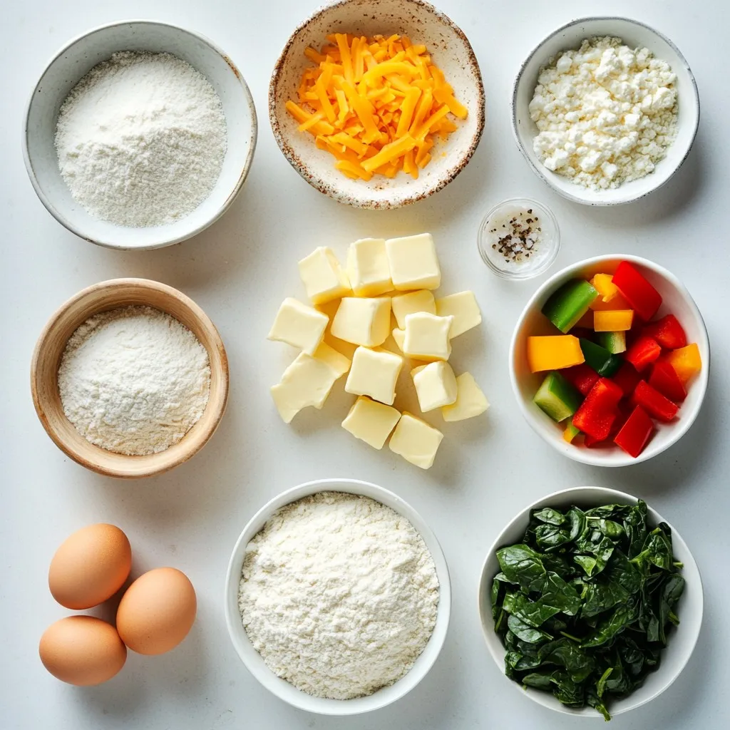- 1 ½ cups all-purpose flour - ½ teaspoon salt - ½ cup unsalted butter, cold and cut into small cubes - 4-6 tablespoons ice water - 4 large eggs - 1 cup heavy cream - 1 cup milk - 1 cup shredded cheese (Gruyère or cheddar) - 1 cup cooked spinach, thoroughly drained and chopped - ½ cup diced bell peppers (mix of red and green for color) - ¼ cup finely chopped onion - Salt and pepper to taste - A pinch of nutmeg (optional) When making this quiche, you need fresh, quality ingredients. For the crust, start with all-purpose flour and salt. The cold butter is key; it adds flakiness. You can cut it into the flour using a pastry cutter or your fingers. This creates little bits of butter mixed with the flour. Next, we need ice water. Adding this helps the dough come together. Start with four tablespoons and add more if needed. Don’t overmix; you want a tender crust. For the filling, gather eggs, heavy cream, and milk. These create a rich base. The cheese gives flavor and creaminess. Gruyère or cheddar works well, but you can choose your favorite. Then, add cooked spinach for color and nutrition. Diced bell peppers and chopped onion add texture and taste. Season with salt, pepper, and nutmeg for depth. This combination makes a well-balanced filling that everyone will love. {{ingredient_image_2}} 1. Mixing dry ingredients: Start by placing 1 ½ cups of all-purpose flour and ½ teaspoon of salt in a large bowl. Use a whisk to mix them well. This step is key for a balanced flavor. 2. Incorporating butter: Cut ½ cup of cold, unsalted butter into small cubes. Add the butter to the flour mix. Use a pastry cutter or your fingers to blend until it looks like coarse crumbs. You want to see pea-sized pieces of butter. 3. Adding ice water: Gradually pour in 4-6 tablespoons of ice water. Start with 4 tablespoons. Mix gently after each addition until the dough holds together. Avoid overmixing to keep it tender and flaky. 1. Whisking egg mixture: In a large bowl, whisk together 4 large eggs, 1 cup of heavy cream, and 1 cup of milk. Make sure everything is well combined. This mixture gives your quiche its creamy texture. 2. Incorporating cheese and vegetables: Stir in 1 cup of shredded cheese (Gruyère or cheddar), 1 cup of cooked spinach (drained and chopped), ½ cup of diced bell peppers, and ¼ cup of finely chopped onion. Mix well to ensure even flavor. 1. Rolling out dough: On a floured surface, roll the chilled dough into a circle about 1/8 inch thick. Carefully place it in a 9-inch pie plate. Press it gently to fit, leaving a slight overhang. 2. Pouring filling into crust: Pour the egg and vegetable mixture into the prepared crust. Use a spatula to spread it evenly. 3. Baking time and temperature: Preheat your oven to 375°F (190°C). Bake for 35-40 minutes. The quiche should be golden and slightly puffed in the center. Let it cool for 10 minutes before slicing. To get that perfect flaky crust, start with cold ingredients. Use cold butter, and don't let it sit out. The cold butter creates pockets of steam during baking, which makes the crust flaky. If your butter is warm, your crust may turn out dense and tough. Also, avoid overmixing. Mix just until the dough holds together. This keeps the crust tender and light. To spice up your quiche, consider adding herbs and spices. Fresh herbs like thyme or basil elevate the flavors. You can also use spices like paprika or garlic powder for a kick. For cheese, Gruyère and cheddar are great, but don’t stop there. Try feta, goat cheese, or even creamy ricotta to mix things up. Each cheese adds its own unique taste and texture. Make your quiche shine by garnishing it. Fresh herbs like chives or parsley add color and taste. You can arrange your quiche slices on a pretty platter to impress your guests. Pair it with a light green salad dressed in vinaigrette. This adds freshness and balances the rich flavors of the quiche. Enjoying these elements together makes for a delightful meal! Pro Tips Chill Your Ingredients: Keeping the butter and water cold is crucial for a flaky crust. It prevents the butter from melting into the flour too quickly, ensuring the desired texture. Don't Overmix: When forming the dough, mix just until it comes together. Overmixing can develop gluten, resulting in a tough crust instead of a tender one. Use a Blind Bake: If you want a crisper crust, consider blind baking the crust for about 10 minutes before adding the filling. This prevents sogginess. Experiment with Fillings: Feel free to customize your quiche with different vegetables, meats, or cheeses based on your preferences or what you have on hand. The possibilities are endless! {{image_4}} You can change the cheese for a new taste. Feta cheese adds a tangy kick. Goat cheese brings creaminess and depth. If you prefer a vegan option, try cashew or almond cheese. These alternatives melt well and keep the dish rich. Seasonal veggies brighten your quiche. Think about adding asparagus in spring or zucchini in summer. For a heartier meal, toss in proteins like crispy bacon or diced ham. These choices add flavor and texture, making your quiche more filling. Try a Mediterranean twist by adding sun-dried tomatoes, olives, and herbs like oregano. This gives a bright, fresh taste. For something spicy, add jalapeños and pepper jack cheese for a southwestern flair. This variation adds a fun kick that wakes up your taste buds. To keep your quiche fresh, store it in the fridge. Place the leftover slices in an airtight container. You can also wrap them in plastic wrap. This method helps prevent the quiche from drying out. - Duration of freshness: Your quiche stays good for 3 to 4 days in the fridge. After that, it may lose its taste or texture. Always check for any signs of spoilage before eating. Freezing quiche can be a great way to save it for later. Follow these steps for best results. - Let the quiche cool completely before freezing. - Slice it into individual portions. - Wrap each slice 