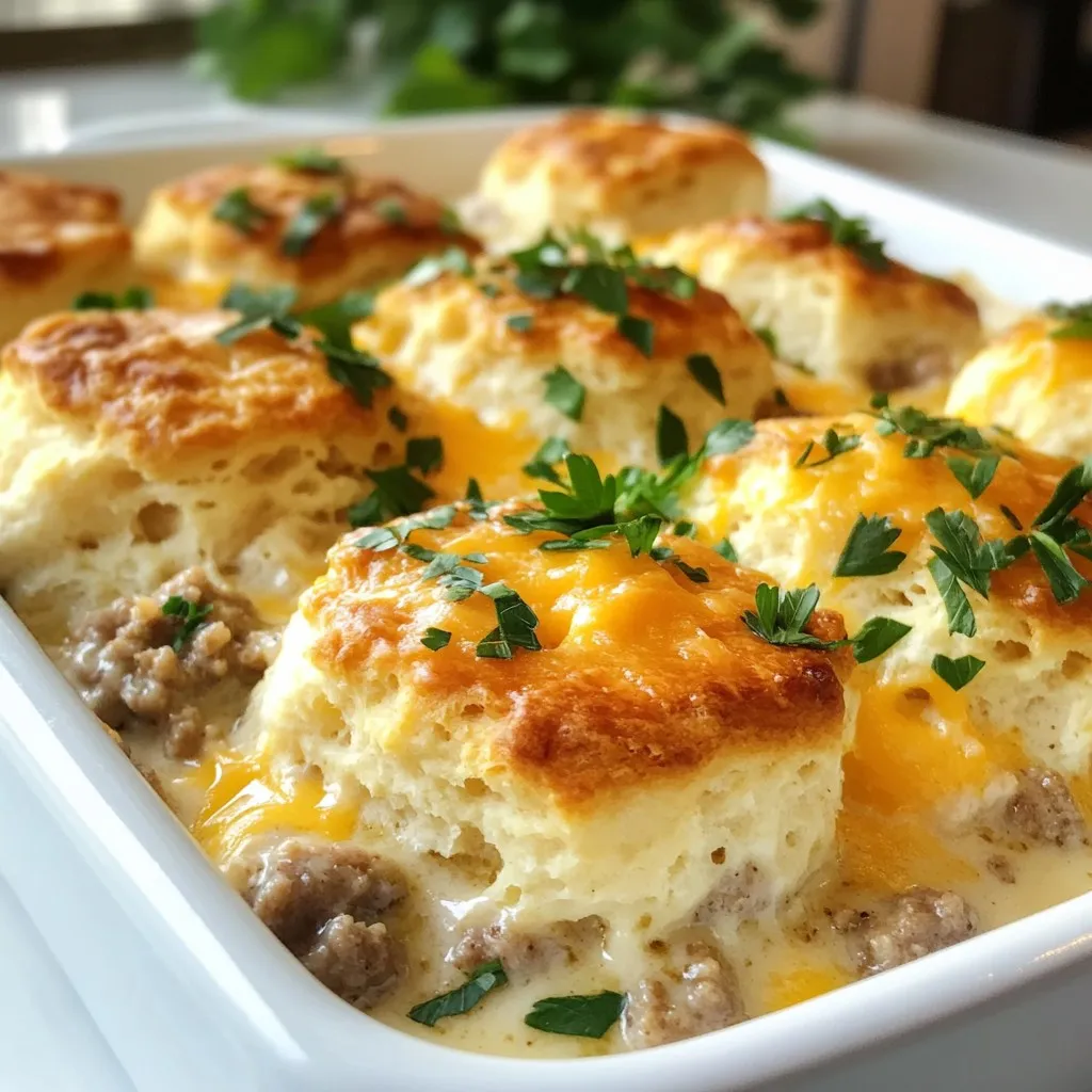 In a greased 9×13 inch baking dish, cut each biscuit into quarters. Spread these biscuit pieces evenly across the bottom of the dish. Pour the sausage gravy over the biscuits, making sure to coat all pieces well. If you like cheese, sprinkle 1 cup of shredded cheddar cheese on top. This adds a rich flavor. Bake the casserole in the oven for 25 to 30 minutes. Look for a golden color on the biscuits to know they are done. Once baked, take it out and let it cool a bit. Garnish with fresh parsley for a pop of color. This step makes your dish look even better!