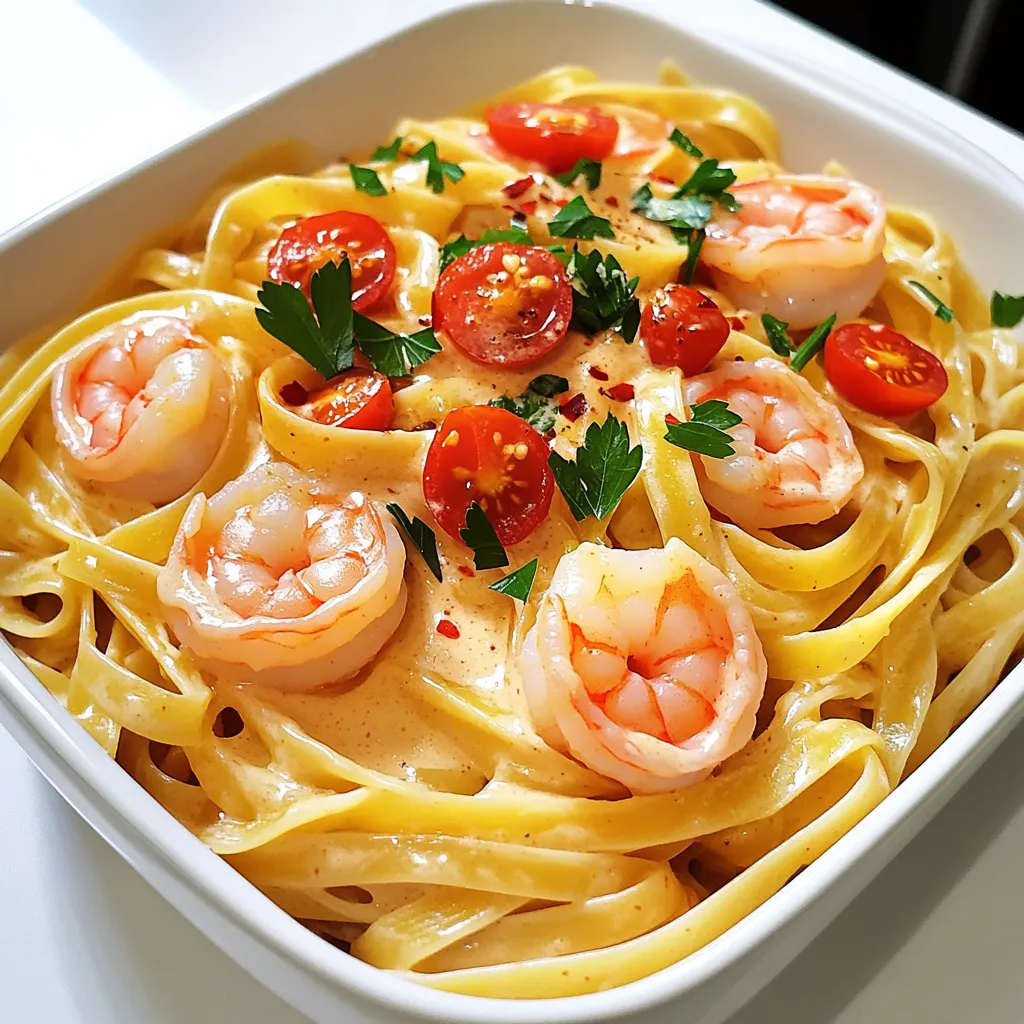 These ingredients work together to create a rich and creamy dish. The linguine serves as a perfect base, while the large shrimp add a sweet flavor and a nice texture. The unsalted butter and garlic create a fragrant sauce. Heavy cream gives the dish its creaminess, and cherry tomatoes add a fresh burst. Red pepper flakes add a bit of heat, balancing the richness. Parmesan cheese contributes a salty, nutty flavor. Fresh parsley and lemon zest brighten the dish and make it look beautiful on the plate.