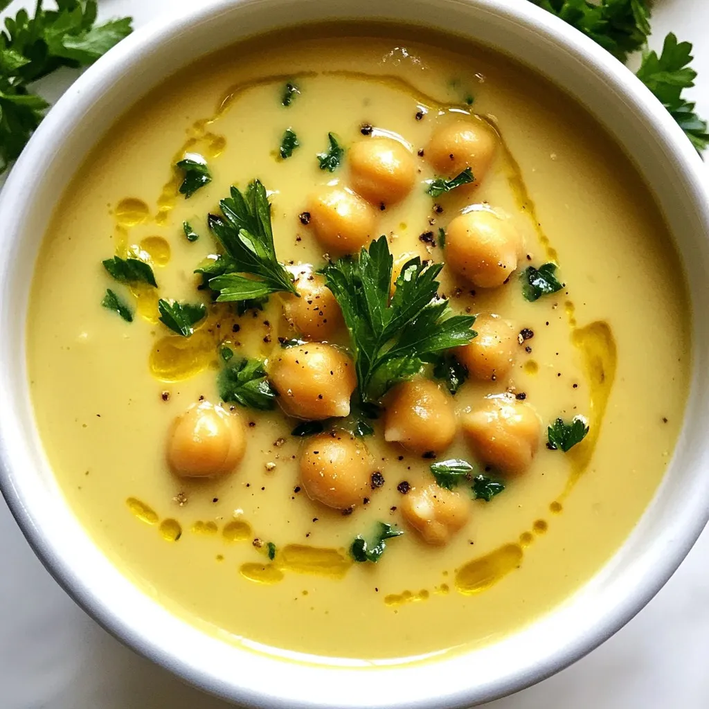 - 2 cans (15 oz) chickpeas, thoroughly drained and rinsed - 1 large onion, finely chopped - 4 cloves garlic, minced - 4 cups vegetable broth (low-sodium preferred) - 1 cup full-fat coconut milk Chickpeas are the star of this soup. They add protein and fiber, making it hearty. The onion and garlic build a savory base. Coconut milk brings a rich creaminess that rounds out the flavors. - 1 teaspoon ground cumin - 1 teaspoon smoked paprika - Salt and freshly ground black pepper to taste Ground cumin adds warmth with its earthy notes. Smoked paprika gives a hint of smokiness. Salt and pepper enhance the soup’s flavor and balance the creamy texture. - Fresh parsley, finely chopped (for garnish) - 1 tablespoon freshly squeezed lemon juice - 2 tablespoons extra virgin olive oil Fresh parsley adds a bright touch and color. Lemon juice lifts the flavors and adds freshness. A drizzle of olive oil on top gives a nice finish and richness. This combination of ingredients creates a tasty and warm bowl of creamy garlic chickpea soup. Each element plays a role in developing depth and flavor. You can mix and match some ingredients to fit your taste. Enjoy this soup on a chilly day or whenever you need comfort. {{ingredient_image_2}} Sautéing the Onion Warm 2 tablespoons of extra virgin olive oil in a large pot over medium heat. Once the oil is hot, add 1 finely chopped large onion. Sauté the onion for 5 to 7 minutes. Stir it regularly until it becomes soft and clear. Adding Garlic and Spices Next, add 4 minced cloves of garlic, 1 teaspoon of ground cumin, and 1 teaspoon of smoked paprika to the pot. Stir the mix for about 1 minute. This lets the spices toast and gives the soup a great aroma. Incorporating Chickpeas and Broth Now, add 2 cans of thoroughly drained and rinsed chickpeas into the pot. Pour in 4 cups of low-sodium vegetable broth as well. Increase the heat to bring the mix to a rapid boil. Once boiling, lower the heat to let it simmer for 15 minutes. This helps the flavors blend well. Blending Until Smooth After simmering, take the pot off the heat. Use an immersion blender to purée the soup until it is completely smooth. If you do not have an immersion blender, transfer the soup in batches to a regular blender. Blend each batch until it is silky. Adding Coconut Milk Return the blended soup to low heat. Stir in 1 cup of full-fat coconut milk. Let it warm through and blend well for about 5 minutes. If you want a thinner soup, add more vegetable broth until it reaches your preferred thickness. Seasoning and Serving Finally, season the soup with salt, freshly ground black pepper, and 1 tablespoon of freshly squeezed lemon juice. Adjust the seasoning to fit your taste. Serve the soup hot and garnish with finely chopped fresh parsley for a touch of color and flavor. - Toasting Spices: Toast spices in the pot before adding other ingredients. This step makes the flavors pop. When you heat the spices, they release their oils. This adds a rich, deep taste to your soup. I always toast cumin and paprika for this recipe. - Adjusting Thickness: If you want a thicker soup, let it simmer longer. For a thinner soup, add more vegetable broth. Gradually add broth until you reach your preferred consistency. It’s all about what you like! - Serving Suggestions: Serve the soup in rustic bowls. This gives a cozy feel. You can also drizzle a bit of coconut milk or olive oil on top. This adds a nice touch and makes it look fancy. Whole chickpeas or parsley leaves can add elegance. - Garnishing Techniques: For garnish, sprinkle fresh parsley on top. This adds color and brightness. You can also use lemon zest for a fresh kick. Just a little zest can take your soup to the next level. - Best Blender Options: An immersion blender works best for this soup. It makes blending easy and quick. If you don’t have one, a regular blender is fine too. Just be careful with hot soup! - Recommended Cookware: Use a large pot for cooking. A heavy-bottomed pot helps with even heating. This prevents burning and keeps your soup creamy and smooth. Pro Tips Use Fresh Herbs: Adding a handful of fresh herbs like cilantro or basil just before serving can elevate the flavor profile of your soup. Adjust Consistency: If you prefer a thinner soup, gradually add more vegetable broth until you reach your desired consistency. Spice It Up: For an extra kick, consider adding a pinch of cayenne pepper or red pepper flakes when sautéing the onions. Meal Prep Friendly: This soup stores well in the refrigerator for up to 5 days, making it a great option for meal prep or leftovers. {{image_4}} Using Different Beans You can swap chickpeas for other beans. Try black beans or white beans. Each type adds its own flavor and texture. This change keeps the soup fresh and exciting. Dairy-Free Alternatives If you want a lighter soup, use almond milk or oat milk instead of coconut milk. These options offer a different taste while keeping the soup creamy. Each choice brings its own unique twist. Adding Greens (Spinach/Kale) Adding greens makes the soup healthier and more vibrant. Toss in fresh spinach or chopped kale while cooking. They wilt quickly and blend well with the soup's texture. Experimenting with Other Spices Feel free to add your favorite spices. A dash of chili powder can spice things up. You could also try curry powder for a warm, comforting flavor. Mixing spices can lead to new flavor profiles. Perfect Pairings (Bread, Salad) This soup pairs well with crusty bread or a light salad. A slice of sourdough adds crunch. A fresh green salad complements the warmth of the soup. Transforming into a Stew If you want a thicker meal, turn your soup into a stew. Just reduce the broth and add more veggies. This creates a hearty dish that's perfect for chilly days. To store the leftovers, let the soup cool down first. Pour it into an airtight container. This keeps it fresh for up to four days in the fridge. You can enjoy it again within this time frame. Just re