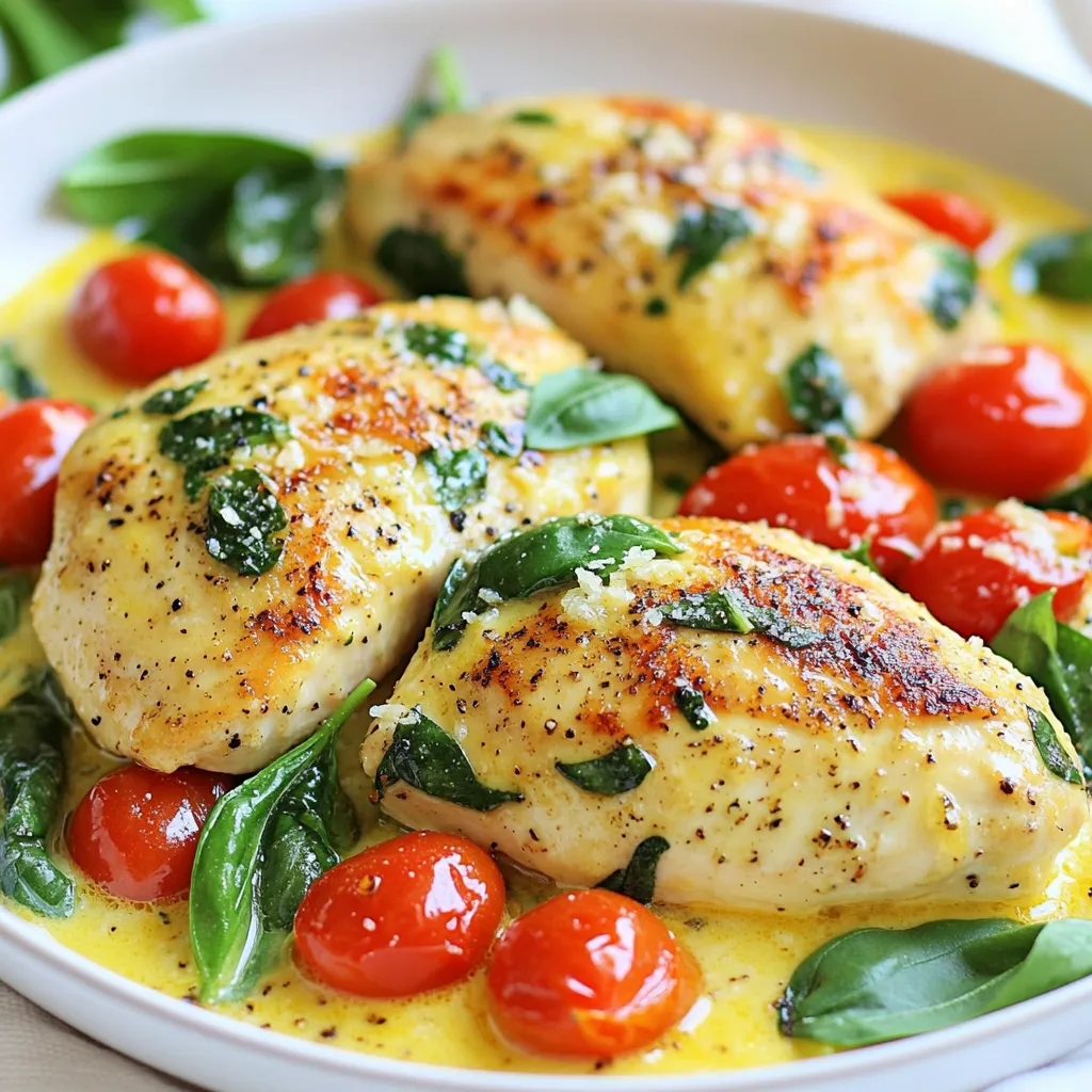- 4 boneless, skinless chicken breasts - 2 tablespoons olive oil - 4 cloves garlic, minced - 1 cup heavy cream - 1 cup cherry tomatoes, halved - 1 cup fresh spinach leaves - ½ cup grated Parmesan cheese - 1 teaspoon Italian seasoning - Salt and pepper to taste - Fresh basil leaves for garnish - Large skillet - Tongs - Measuring cups - Measuring spoons - Wooden spoon or spatula - Cutting board - Knife - For a lighter version, use half-and-half instead of heavy cream. - You can swap chicken for shrimp or tofu for a vegetarian option. - Add bell peppers or zucchini for extra veggies. - Use fresh herbs like thyme or oregano instead of Italian seasoning for a twist. - Try using feta cheese instead of Parmesan for a tangy flavor. {{ingredient_image_2}} To start, grab your chicken breasts. Season them well on both sides with salt, pepper, and Italian seasoning. This mix brings out the best flavors. Use enough seasoning so every bite is tasty. Set the chicken aside while you prepare your skillet. Next, heat two tablespoons of olive oil in a large skillet. Make sure the oil is hot, but not smoking. Place the seasoned chicken breasts carefully in the skillet. Sear each side for about 5 to 7 minutes. You want a nice golden brown color. This step seals in the juices. Once done, take the chicken out and place it on a plate. Now, it’s time to make the creamy sauce. In the same skillet, turn the heat down to medium-low. Add four minced garlic cloves and sauté them for about one minute. Stir often to avoid burning. When the garlic smells great, slowly pour in one cup of heavy cream. Stir as you add it to mix with the garlic. Let this simmer gently. Next, stir in one cup of halved cherry tomatoes and one cup of fresh spinach leaves. Cook for about three to four minutes. You want the tomatoes to soften and the spinach to wilt. After that, add in half a cup of grated Parmesan cheese. Keep stirring until the sauce is creamy and well mixed. Taste it and add more salt or pepper if needed. Finally, return your seared chicken breasts to the skillet. Make sure they are coated in the creamy sauce. Let them simmer together for two to three more minutes. This will warm everything and help the flavors blend. You are now ready to serve! To get the best sear on your chicken, follow these simple steps: - Use a hot skillet: Heat your skillet well before adding the chicken. This helps to lock in the moisture. - Don't overcrowd the pan: If you add too much chicken, it will steam instead of sear. Cook in batches if needed. - Let it cook: Avoid flipping the chicken too soon. Let it sit for 5-7 minutes to form that golden crust. To make your sauce truly creamy, keep these tips in mind: - Use heavy cream: It has a rich texture that helps create a velvety sauce. - Stir continuously: As you add the cream to the garlic, stir non-stop. This blends the flavors perfectly. - Add cheese slowly: Incorporate the grated Parmesan a little at a time for a smooth finish. Pair your Creamy Garlic Tuscan Chicken with these tasty options: - Garlic bread: Warm and crusty, it’s perfect for soaking up the sauce. - Pasta: Serve over your favorite pasta for a comforting meal. - Fresh salad: A light salad provides a crunchy contrast to the creamy chicken. - Wine: A glass of white wine, like Chardonnay, complements the dish beautifully. Pro Tips Use Fresh Ingredients: Fresh garlic, spinach, and tomatoes will enhance the flavor profile of your dish, making it more vibrant and delicious. Don’t Overcook the Chicken: Ensure the chicken is cooked just until it reaches an internal temperature of 165°F (75°C) to keep it juicy and tender. Customize the Creaminess: Adjust the amount of heavy cream and Parmesan cheese to achieve your desired level of creaminess in the sauce. Pair with Sides: This dish pairs wonderfully with garlic bread, pasta, or a crisp salad to create a well-rounded meal. {{image_4}} You can swap chicken for shrimp or tofu. Shrimp cooks fast. Just sauté it until it turns pink, about 3-4 minutes. Tofu needs a little more care. Press it to remove water, then cube and sauté until golden. Both options keep the dish tasty and fun. Feel free to mix in different veggies. Try bell peppers or zucchini for a colorful twist. Mushrooms add a nice earthy flavor. You can also toss in broccoli or asparagus. They cook well and add crunch. Always remember to adjust the cooking time based on the veggies you pick. You can lighten up this dish easily. Use chicken breast but swap heavy cream for coconut milk or almond milk. This keeps it creamy without the calories. For cheese, try nutritional yeast for a cheesy taste without dairy. This way, you enjoy great flavor while sticking to your health goals. To keep your Creamy Garlic Tuscan Chicken fresh, place leftovers in an airtight container. Make sure to cool it to room temperature first. Store it in the fridge. It will last for about 3 to 4 days. Always label the container with the date. This helps you track how long it’s been stored. When you’re ready to eat the leftover chicken, take it out of the fridge. You can reheat it on the stove for the best flavor. Heat a skillet over low heat. Add a splash of cream or broth to keep it moist. Stir gently until it’s warmed through. You can also use a microwave. Place the chicken in a microwave-safe dish. Cover it with a lid or microwave-safe wrap. Heat in short bursts, checking often. This helps avoid overcooking. Freezing is a great way to save this dish for later. First, let the chicken cool completely. Then, place it in a freezer-safe container. You can also use freezer bags, squeezing out the air. Properly stored, it can last for up to 3 months. When you’re ready to eat it, thaw it in the fridge overnight. Reheat as described above. This way, you can enjoy your creamy chicken at a later date! You can serve this dish with many sides. Here are my favorites: - Warm garlic bread - Steamed rice or risotto - Pasta, like fettuccine or spaghetti - Fresh