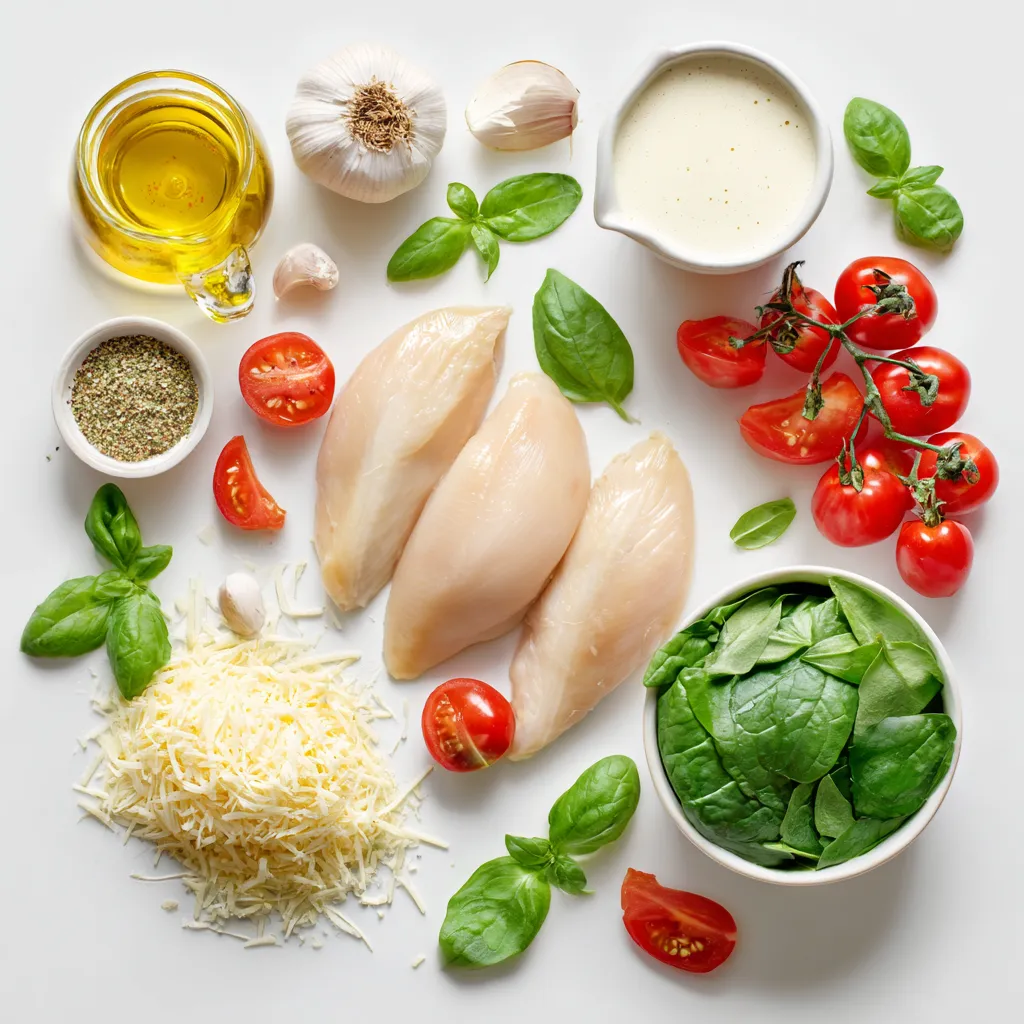 A delicious and creamy chicken dish infused with garlic, cherry tomatoes, and spinach, topped with Parmesan cheese.