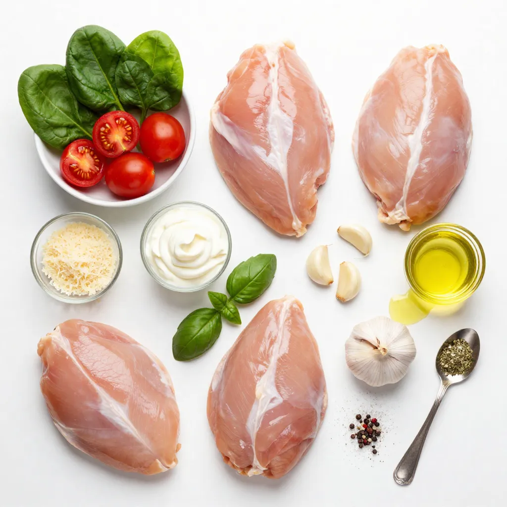 The main ingredients create the heart of this dish. Chicken breasts provide a nice base. The olive oil adds flavor and helps cook the chicken. Garlic gives a wonderful aroma and taste. Cherry tomatoes bring a touch of sweetness. Fresh spinach adds color and nutrients. Heavy cream and Parmesan cheese create that rich, creamy sauce.
