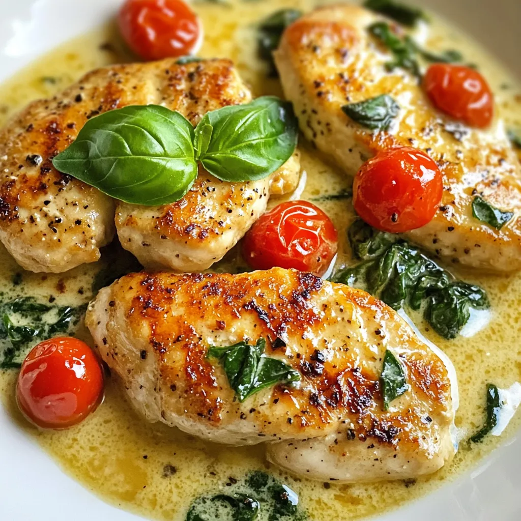 - 4 boneless, skinless chicken breasts - 2 tablespoons olive oil - 4 cloves garlic, minced - 1 cup cherry tomatoes, halved - 1 cup fresh baby spinach The main ingredients form the heart of this dish. Chicken breasts provide a nice, tender protein base. Olive oil gives a rich flavor and helps with cooking. Garlic adds a bold taste that shines through. Cherry tomatoes bring sweetness and a pop of color. Baby spinach adds a fresh and healthy touch. - 1 cup heavy cream - 1/2 cup grated Parmesan cheese - 1 teaspoon Italian seasoning - Salt and freshly cracked black pepper, to taste Heavy cream makes the sauce rich and smooth. Parmesan cheese adds a salty, nutty flavor that enhances the dish. Italian seasoning gives it a classic taste. Salt and pepper help balance all the flavors. - Fresh basil leaves Fresh basil leaves finish off the dish nicely. They add a burst of color and a hint of sweetness. Garnishing your creamy garlic Tuscan chicken with basil makes it look beautiful and appetizing. {{ingredient_image_2}} - First, season the chicken. Use salt, pepper, and Italian seasoning. Make sure to cover both sides well. This adds great flavor to the chicken. - Next, sear the chicken breasts. Heat olive oil in a skillet over medium-high heat. Once the oil is hot, add the chicken. Cook for 5-7 minutes on each side. The chicken should be golden brown and cooked through. Remove it from the skillet and cover it to keep warm. - Now, sauté the garlic. Use the same skillet and lower the heat to medium. Add the minced garlic and stir for about 30 seconds. You want it to smell nice and be lightly golden. - Then, cook the cherry tomatoes. Add the halved tomatoes to the skillet. Stir gently for 2-3 minutes until they start to soften and burst. This releases their juicy flavor. - After that, add the spinach. Stir in the fresh baby spinach and cook for about 2 minutes. You want it to wilt down nicely. - Next, incorporate the heavy cream. Pour it into the skillet, stirring gently. Bring the mix to a gentle simmer. - Then, add the Parmesan cheese. Gradually stir in the grated cheese. Keep mixing until it melts and combines into a smooth sauce. - Finally, mix with the chicken. Return the seared chicken to the skillet. Let it simmer in the creamy sauce for 3-5 minutes. This allows all the flavors to meld. Enjoy the rich taste of your creamy garlic Tuscan chicken! - Tips for seasoning: Start with salt and pepper. Use Italian seasoning to boost flavor. Don't rush; let the spices soak in for a few minutes. - Achieving the right creaminess: Use heavy cream for a rich sauce. Stir in Parmesan cheese slowly. This helps create a smooth texture. If it feels too thick, add a splash of chicken broth. - Doneness check for chicken: Use a meat thermometer. The internal temperature should reach 165°F. Look for a golden brown color on the outside for a nice finish. - Searing vs. baking: Searing gives the chicken a crisp outside. Baking can dry it out. I prefer searing for juicy results. It also adds flavor to the sauce. - Value of resting time: Let chicken rest after cooking. This keeps it moist and tender. A few minutes is all it needs to lock in juices. - Best sides to accompany the dish: Mashed potatoes are a perfect match. Pasta also works well, soaking up the creamy sauce. Steamed veggies balance the meal nicely. - Presentation tips for serving: Serve the chicken on a bright plate. Drizzle extra sauce over the top. Add fresh basil leaves for color and fresh flavor. This makes the dish look great and inviting. Pro Tips Perfectly Sear the Chicken: Ensure your skillet is hot enough before adding the chicken. This will create a beautiful golden crust and lock in juices for a moist chicken. Use Fresh Ingredients: Fresh garlic, tomatoes, and spinach will elevate the flavor of the dish. Opt for high-quality Parmesan cheese for a richer sauce. Adjust Creaminess: If you prefer a lighter sauce, substitute half of the heavy cream with chicken broth. This adds flavor without the extra calories. Garnish with Flair: Don’t skip the fresh basil garnish. It not only adds color but also a fresh, aromatic finish that complements the creamy sauce beautifully. {{image_4}} Alternative proteins You can use chicken thighs instead of chicken breasts. They add more flavor and stay juicy. For a lighter option, try turkey cutlets. Fish like salmon or shrimp also work well in this dish. Dairy-free options If you want a dairy-free version, swap heavy cream for coconut cream. Use nutritional yeast in place of Parmesan cheese for a cheesy flavor without dairy. Adding spices To boost flavor, add red pepper flakes for heat. Smoked paprika gives a nice depth, too. Experiment with fresh herbs like thyme or oregano for a new twist. Incorporating vegetables You can add bell peppers or zucchini to the mix. They bring color and extra nutrients. Mushrooms also add a rich, earthy taste that pairs well with the sauce. Gluten-free adjustments To make this gluten-free, ensure your seasoning blends and broth are certified gluten-free. You can serve the dish over rice or gluten-free pasta instead of regular pasta. One-pan meal idea For a quick cleanup, try making this dish as a one-pan meal. Add your protein, veggies, and sauce all at once. Cook until everything is done and enjoy a simple yet delicious meal. To store leftovers, let the creamy garlic Tuscan chicken cool completely. Place it in an airtight container. Make sure to seal it well to keep the flavors fresh. This dish will stay good in the fridge for up to three days. For storage containers, use glass or plastic that is safe for the fridge. These materials help keep your food fresh and tasty. When reheating, use a skillet over low heat. This method warms the chicken evenly. Stir the sauce gently to avoid separation. You can also use the microwave. If you do, heat it in short bursts. Stir in between to keep the sauce smooth. Yes, you can freeze creamy garlic Tuscan chicken! To do this, let it cool and then t