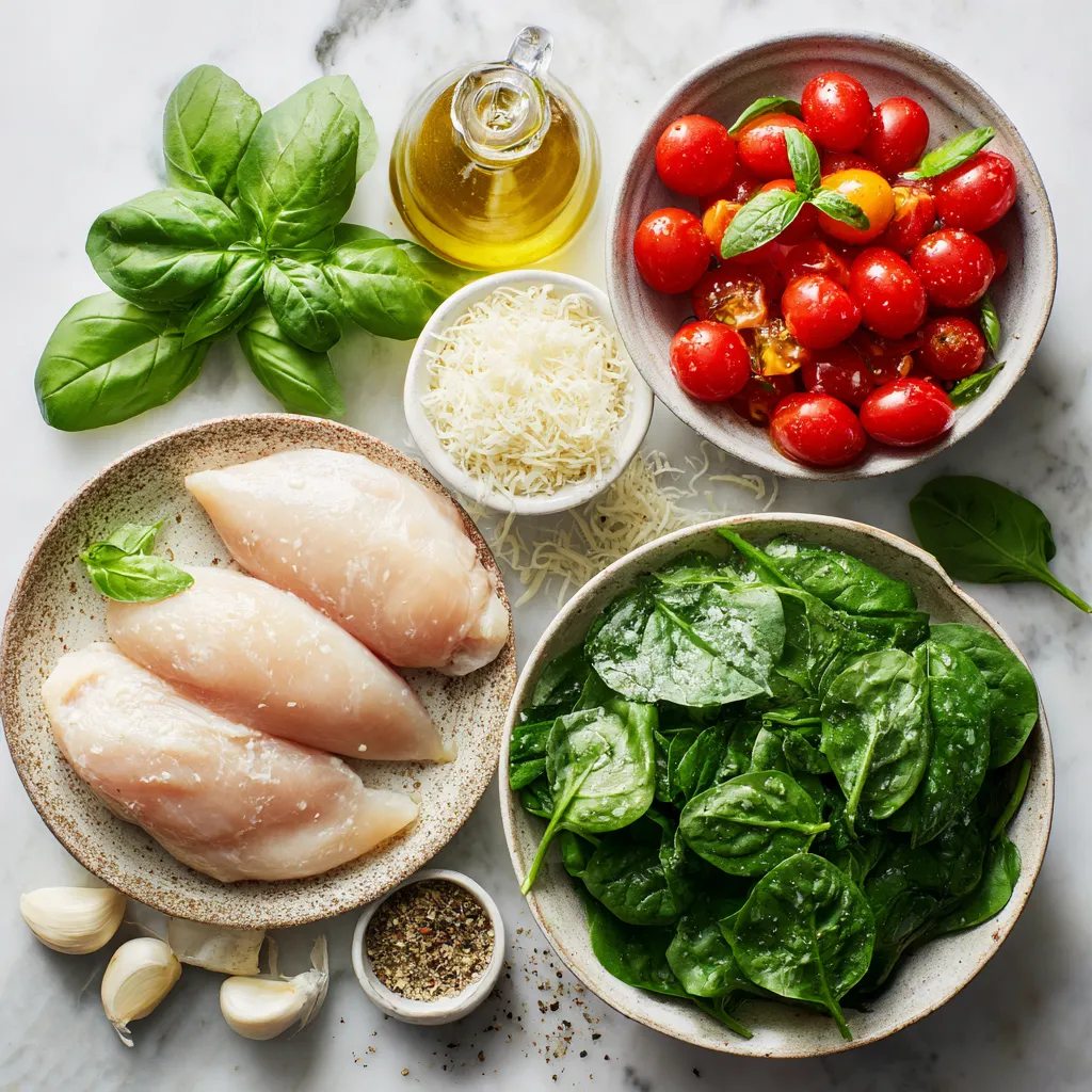 The main ingredients form the heart of this dish. Chicken breasts provide a nice, tender protein base. Olive oil gives a rich flavor and helps with cooking. Garlic adds a bold taste that shines through. Cherry tomatoes bring sweetness and a pop of color. Baby spinach adds a fresh and healthy touch.