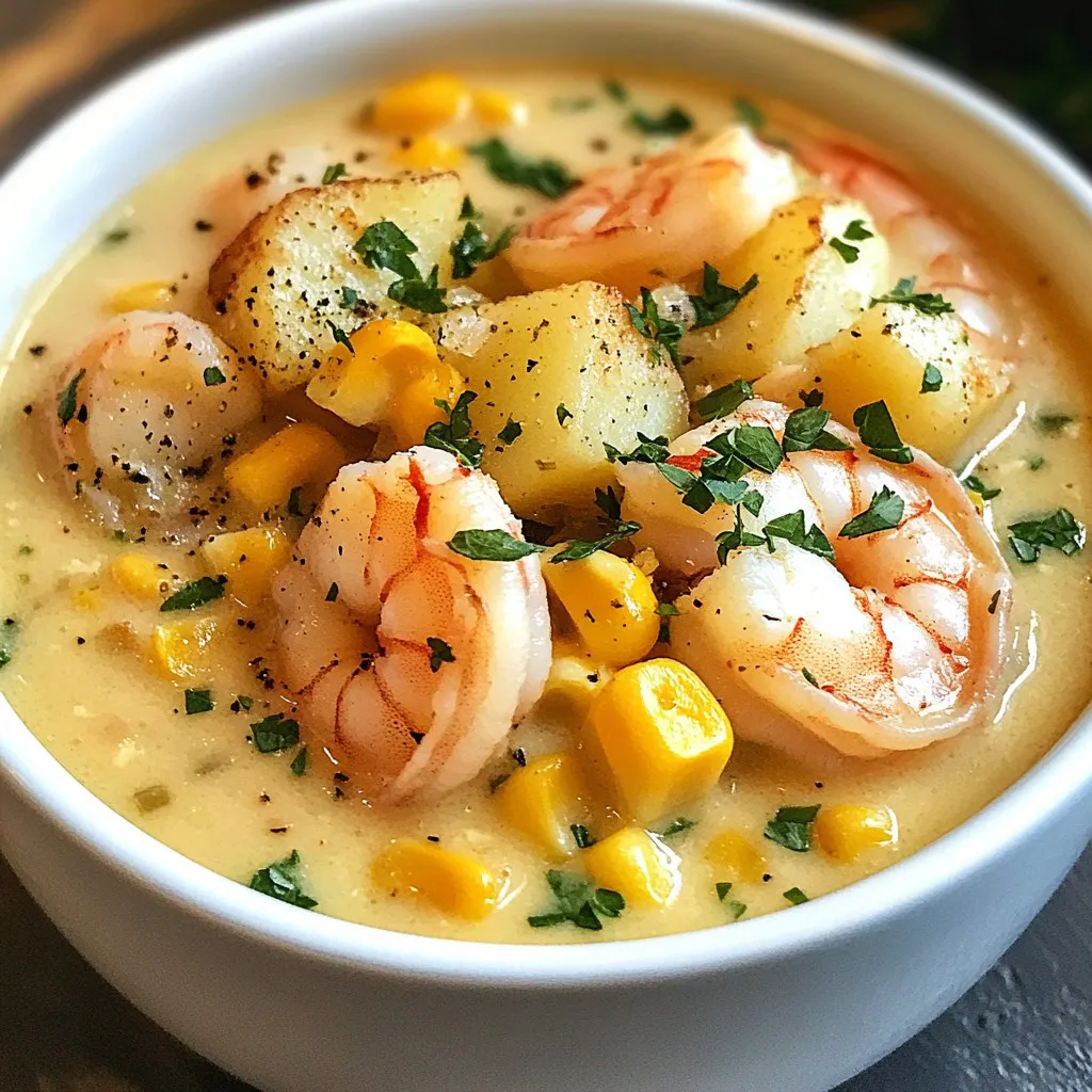 - Large shrimp, peeled and deveined - Fresh or frozen corn kernels - Onion, garlic, potatoes, celery - Vegetable broth and heavy cream - Seasonings: smoked paprika, cayenne pepper, salt, and pepper - Butter and fresh parsley for garnish To make this chowder, you need key ingredients. Start with large shrimp. Make sure they are peeled and deveined for the best texture. Next, grab fresh or frozen corn kernels. Both options work well. You will also need some veggies. Use one medium onion, two cloves of garlic, two medium potatoes, and one cup of diced celery. These add great flavor and texture. For the base of the chowder, you will need four cups of vegetable broth. This keeps it light yet tasty. Then, add one cup of heavy cream. This makes the chowder rich and creamy. Now, let’s spice things up! You need one teaspoon of smoked paprika. If you like heat, add half a teaspoon of cayenne pepper. Don’t forget salt and pepper to taste. Finally, use two tablespoons of butter. This will help sauté the veggies. Top it off with fresh parsley for a bright finish. With these ingredients, you create a bowl of joy and comfort. {{ingredient_image_2}} Start by placing a large pot over medium heat. Add 2 tablespoons of butter and let it melt. Once melted, add 1 finely chopped onion and 1 cup of diced celery. Cook these together for about 5 minutes. You want the onion to become soft and clear. This step builds a rich base for your soup. Next, add 2 minced garlic cloves to the pot. Cook it for about 1 minute. The garlic should smell nice and fragrant, adding depth to your chowder. Now it's time to make the chowder hearty. Add 2 diced potatoes, 4 cups of vegetable broth, and 2 cups of corn kernels to the pot. Sprinkle in 1 teaspoon of smoked paprika and 1/2 teaspoon of cayenne pepper if you like some heat. Season with salt and pepper to taste. Bring this mixture to a boil. After boiling, reduce the heat. Let it simmer for 15 to 20 minutes. You want the potatoes to be soft when you poke them with a fork. When your potatoes are tender, it’s time to add the stars of the dish. Toss in 1 pound of peeled and deveined shrimp. Cook for 5 to 7 minutes, stirring gently. You’ll know it’s done when the shrimp turns pink and opaque. Now, lower the heat again and pour in 1 cup of heavy cream. Stir it well and let it warm for another 3 to 4 minutes. Avoid boiling to keep the cream smooth. Taste your chowder and adjust the seasoning with more salt and pepper if needed. Let the chowder sit for a couple of minutes. This will help it thicken slightly. Serve your chowder hot, with fresh parsley on top for color and flavor. Enjoy the delightful comfort of your homemade shrimp and corn chowder! To keep your chowder creamy, avoid boiling after adding the cream. Boiling can cause the cream to curdle. Instead, gently heat it until warm. This keeps the texture smooth and rich. Adjusting heat levels is key. After adding the cream, lower the heat to medium-low. This prevents any sudden changes that could affect the cream's texture. You can elevate the flavor of your chowder with extra seasonings. Try adding thyme or dill for a fresh taste. A squeeze of lemon juice can also brighten the dish. To gain depth of flavor, caramelize some corn. Heat a small pan over medium heat, add a bit of butter, and cook the corn until golden. Sprinkle this over the chowder just before serving. It adds a nice crunch and a sweet touch. Pro Tips Fresh Corn is Best: If possible, use fresh corn on the cob for the sweetest flavor. Simply shave off the kernels and add them to the chowder for a burst of freshness. Perfectly Cooked Shrimp: To keep shrimp tender, avoid overcooking them. They should only take 5-7 minutes to turn pink and opaque; any longer and they may become tough. Season Gradually: It's best to season your chowder gradually. Start with a little salt and pepper, then taste and adjust as needed to enhance the flavors without overpowering them. Thickening Tips: If you prefer a thicker chowder, consider mashing a few of the cooked potatoes in the pot or adding a cornstarch slurry to achieve your desired consistency. {{image_4}} You can easily change some ingredients in this chowder. If you want to swap the shrimp, try using crab or scallops. Both options add a different taste while still being delicious. If you prefer a veggie chowder, replace the shrimp with mushrooms or tofu. You can keep the corn for sweetness and texture. For those who want a dairy-free option, use cashew cream or coconut milk instead of heavy cream. These alternatives will give you a creamy texture without the dairy. Adjusting the spice level is simple. If you want more heat, add more cayenne pepper. Start with a pinch and taste as you go. You can also try different spices. For a smoky flavor, add chipotle powder. For a fresh kick, consider using fresh jalapeños. These changes can make your chowder unique. Experimenting with spices keeps the dish exciting and fresh. To store your chowder, let it cool down first. This step helps keep it fresh. Once it cools, transfer it to airtight containers. Be sure to seal them tightly. You can keep chowder in the fridge for up to three days. For longer storage, freeze it. In the freezer, it lasts about three months. Just remember to label your containers with the date. When reheating chowder, do it slowly. You can use a pot on the stove or a microwave. If you use the stove, heat on low. Stir often to avoid burning. If you microwave, do it in short bursts. Stop to stir in between. This keeps the texture smooth and creamy. If it seems too thick, add a splash of broth or cream. This will help bring it back to life. Yes, you can make this chowder ahead of time. To store it, let it cool completely. Then, transfer it to an airtight container. You can keep it in the fridge for up to three days. When you’re ready to eat, reheat the chowder on the stove over low heat. Stir often to keep it from sticking. If it seems too thick, add a splas