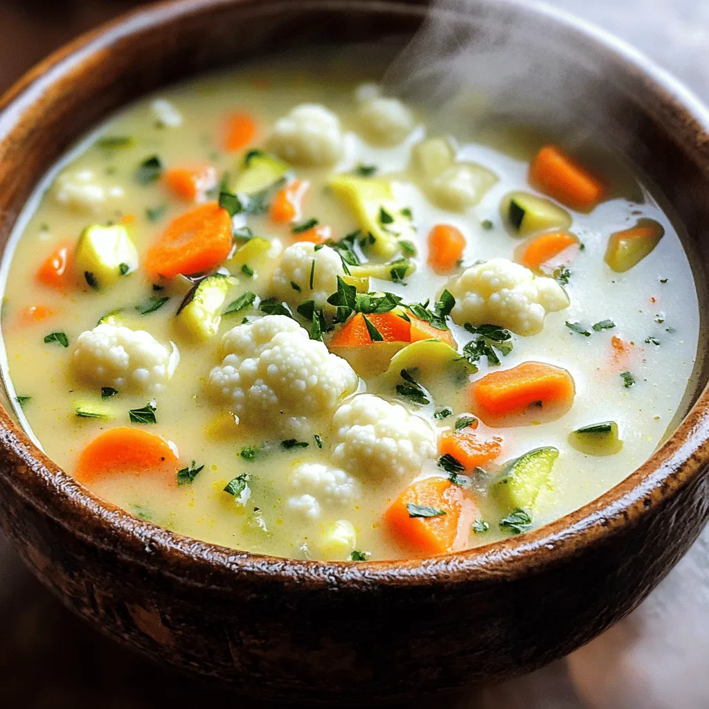 ![- 1 tablespoon olive oil - 1 medium onion, finely diced - 2 cloves garlic, minced - 2 medium carrots, peeled and diced - 1 medium zucchini, diced - 1 cup green peas (fresh or frozen) - 1 cup cauliflower florets, chopped - 4 cups vegetable broth - 1 cup coconut milk To make a creamy vegetable soup, start with olive oil, onion, and garlic. The olive oil adds a nice richness. The onion gives a sweet base flavor. Garlic brings a warm, aromatic touch. Next, choose fresh vegetables like carrots, zucchini, and cauliflower. Carrots add sweetness and color. Zucchini brings a mild flavor and a tender texture. Cauliflower gives the soup a creamy feel when blended. For the broth and creaminess, use vegetable broth and coconut milk. Vegetable broth adds depth. Coconut milk makes the soup rich and smooth. Together, these ingredients create a lovely balance of flavors. - 1 teaspoon dried thyme - ½ teaspoon smoked paprika - Salt and freshly ground black pepper to taste - Fresh parsley, chopped (for garnish) Now, season your soup with dried thyme and smoked paprika. Thyme adds a warm herbal note. Smoked paprika gives a hint of smokiness. Use salt and pepper to taste, adjusting as you go. Finally, top your soup with fresh parsley. It adds a pop of color and a fresh taste. This simple garnish makes the soup look inviting and bright. For the complete recipe, check the [Full Recipe]. Start by heating 1 tablespoon of olive oil in a large pot over medium heat. Once the oil is hot, add 1 medium onion, finely diced, and 2 cloves of minced garlic. Sauté these for about 3-4 minutes. Keep stirring until the onion is soft and clear. This step builds a strong flavor base for your soup. Next, add 2 medium carrots, peeled and diced, along with 1 medium zucchini, diced, and 1 cup of chopped cauliflower florets. Cook these vegetables for an additional 5 minutes. Stir often until they begin to soften. This mix of veggies adds color and nutrition to your dish. Now, pour in 4 cups of vegetable broth. This broth acts as the heart of the soup. Add 1 cup of green peas, 1 teaspoon of dried thyme, and ½ teaspoon of smoked paprika. Bring this mixture to a boil. After it boils, lower the heat and let it simmer uncovered for about 15 minutes. The goal is to cook until all the vegetables are tender and full of flavor. Once the soup has simmered, remove it from the heat. Use an immersion blender to carefully purée the soup until it is smooth and creamy. If you prefer, you can also transfer the soup in batches to a countertop blender. Blend until the mixture is silky. This step is key for achieving that creamy texture we all love. Return the pot to low heat. Now, stir in 1 cup of coconut milk. This ingredient adds a rich creaminess and a hint of sweetness. Season the soup with salt and freshly ground black pepper to taste. Gently warm the soup for about 5 minutes. This will make sure everything is hot without boiling. Serve the soup hot in bowls. Garnish with fresh chopped parsley for a pop of color. Enjoy your creamy vegetable soup, made with love and fresh ingredients! For the complete recipe, check out the Full Recipe section. Choosing the right vegetables is key to great flavor. I love using fresh carrots, zucchini, and cauliflower. Each adds a unique taste. You can also add sweet potatoes or bell peppers for a twist. Always pick vegetables that are in season. They taste better and have more nutrients. Adjusting the creaminess level is easy. For a lighter soup, use less coconut milk. If you like it rich, add more. You can also blend in some white beans for extra creaminess without extra calories. Garnishing the soup makes it look stunning. I like to sprinkle fresh parsley on top. It adds a pop of color and fresh taste. You can also drizzle a bit of coconut milk for a fancy touch. Serving suggestions are just as important. A slice of crusty bread pairs well with the soup. You can also serve it with a side salad. This makes for a filling meal. For the full recipe, check out the complete guide! {{image_4}} You can change your creamy vegetable soup by using different veggies. Try seasonal vegetables for fresh flavors. For spring, add asparagus or green beans. In summer, use ripe tomatoes and corn. In fall, butternut squash and sweet potatoes shine. You can also experiment with bases. Instead of coconut milk, try almond milk for a nutty twist. This gives the soup a different taste and texture. Each change brings a new layer of flavor to your soup. Adding protein can make your soup heartier. Beans and lentils are great options. They add fiber and keep you full. For example, black beans or chickpeas blend well with the soup. You can add them when you simmer the broth. Another option is chicken or sausage. Cooked chicken pieces are tasty and satisfying. If you like sausage, slice it and sauté it with the onions. This adds a savory kick to the soup. Enjoy making it your own! Check out the Full Recipe for more ideas. To keep your creamy vegetable soup fresh, allow it to cool before storing. Place it in airtight containers to avoid air exposure. This helps maintain its flavor and texture. Store the soup in the fridge for up to three days. If you want to keep it longer, freezing is a great option. For freezing, use freezer-safe containers or bags. Make sure to leave some space for expansion. The soup can last up to three months in the freezer. When reheating the soup, you want to keep it creamy. The best method is to use the stove over low heat. Stir it gently to avoid burning. If you want to use the microwave, do so in short bursts. Stir the soup in between each burst to ensure even heating. To prevent separation, add a splash of water or vegetable broth if it thickens too much. This keeps the texture smooth and enjoyable. Can I make creamy vegetable soup vegan? Yes, you can easily make this soup vegan. Just use vegetable broth and coconut milk. Skip any dairy products. How do I make the soup spicier? To add heat, sprinkle in red pepp