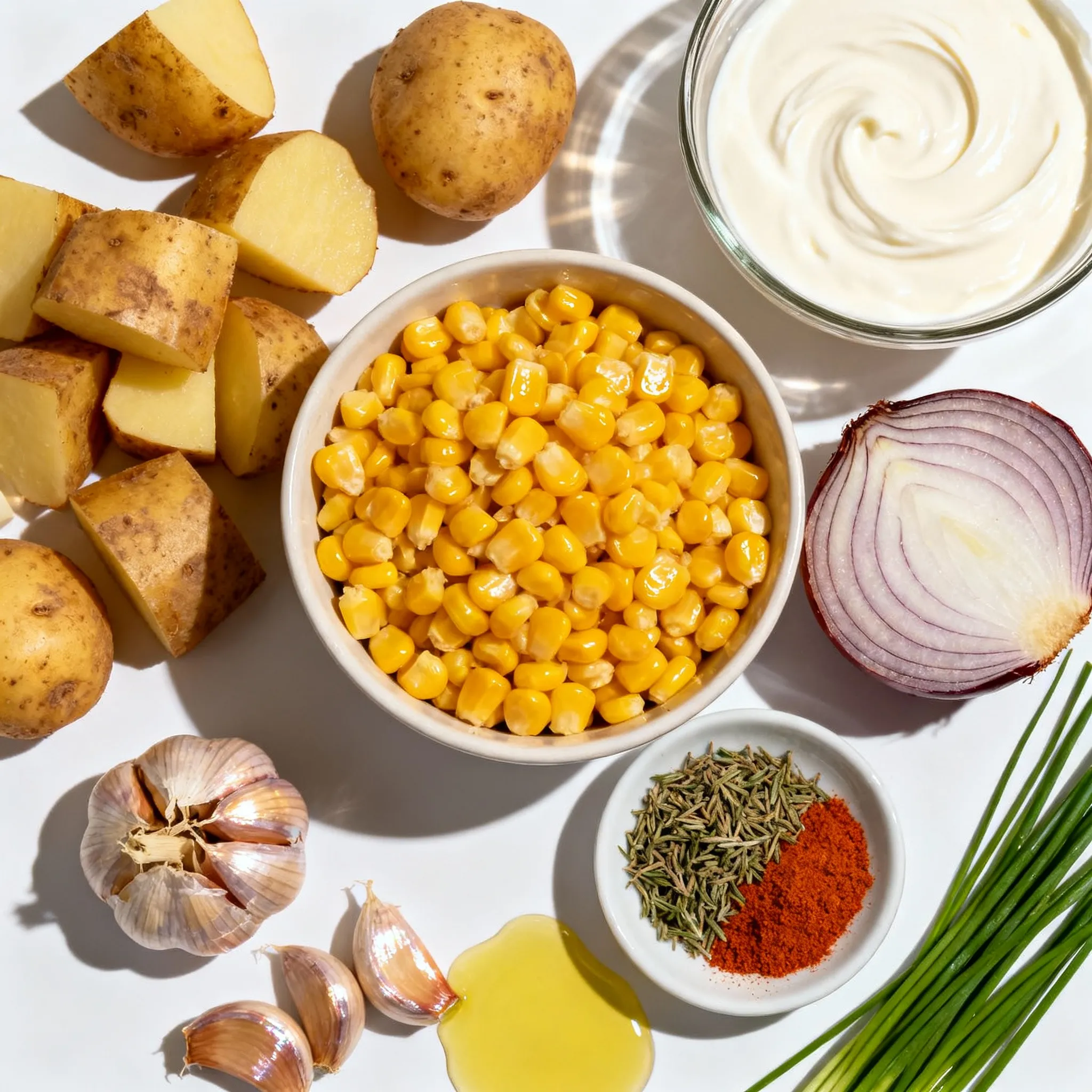 The main ingredients form the base of the chowder. The chicken breasts add protein and flavor. Corn brings sweetness and a lovely texture. The potatoes give the chowder a hearty feel. Onions and garlic add depth to every bite.
