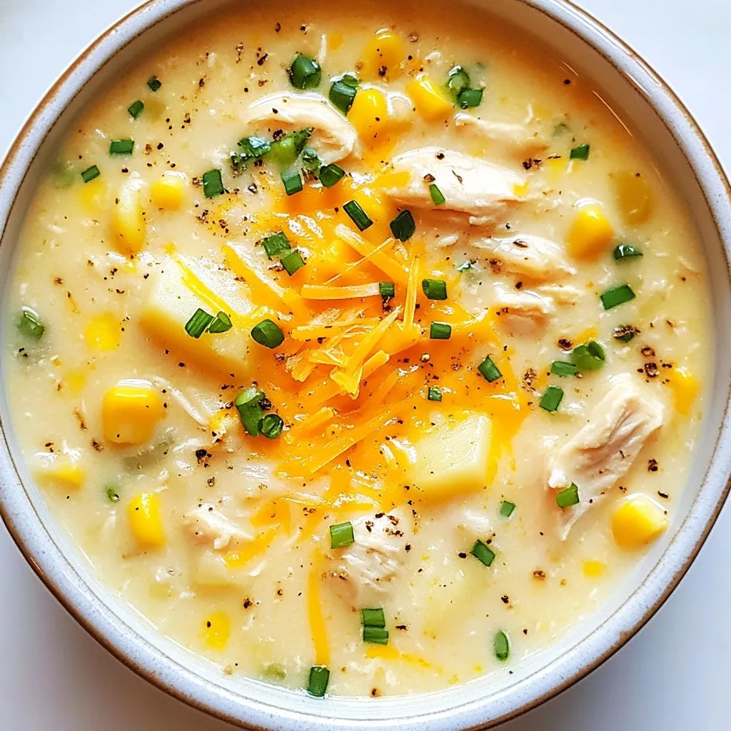 - 2 boneless, skinless chicken breasts - 4 cups corn (fresh, frozen, or canned) - 2 medium potatoes, peeled and diced - 1 medium onion, finely diced - 2 cloves garlic, minced The main ingredients form the base of the chowder. The chicken breasts add protein and flavor. Corn brings sweetness and a lovely texture. The potatoes give the chowder a hearty feel. Onions and garlic add depth to every bite. - 1 teaspoon dried thyme - 1 teaspoon smoked paprika - Salt and freshly ground black pepper Seasonings play a big role in making this chowder shine. Dried thyme gives a warm taste. Smoked paprika adds a hint of smokiness. Salt and pepper help to bring out all the flavors. - 2 cups chicken broth (low sodium recommended) - 1 cup heavy cream - 1 tablespoon olive oil - 1 cup shredded cheddar cheese (for topping) - Fresh chives, chopped (for garnish) These liquids and creamy elements create a rich base. Chicken broth keeps it light yet flavorful. Heavy cream adds a velvety texture. A drizzle of olive oil helps with cooking and flavor. Shredded cheddar on top brings a nice finish, while fresh chives add color and a fresh taste. {{ingredient_image_2}} - Seasoning the chicken: Start by seasoning the chicken breasts. Sprinkle salt, black pepper, and smoked paprika on both sides. This adds flavor and depth to the dish. - Searing the chicken breasts: Heat olive oil in a skillet over medium heat. Carefully place the chicken in the skillet. Sear for about 3-4 minutes on each side. Look for a golden-brown crust. Once done, set the chicken aside. - Adding vegetables and corn: In your crockpot, add the diced onion, minced garlic, and diced potatoes. Then mix in the corn and dried thyme. - Mixing with chicken broth: Pour in the chicken broth. Stir everything gently to combine. Make sure all ingredients are well mixed. - Nestling the chicken: Place the seared chicken breasts on top of the mixed ingredients. Ensure they are slightly submerged in the broth. - Setting cooking times: Cover the crockpot with its lid. Set it to cook on low for 6-8 hours or on high for 3-4 hours. The chicken should be fully cooked and the potatoes tender. - Shredding the chicken: After cooking, carefully remove the chicken from the crockpot. Use tongs to place it on a cutting board. Shred the chicken into bite-sized pieces using two forks. - Incorporating heavy cream: Return the shredded chicken back into the chowder. Pour in the heavy cream and stir well. Let it warm for another 10 minutes on low heat. - Ladling into bowls: Use a ladle to serve the chowder into bowls. - Topping with cheese and chives: Top each bowl with shredded cheddar cheese. Finish with a sprinkle of chopped fresh chives for a pop of color and added flavor. For a richer flavor, add more smoked paprika. This spice brings warmth and depth. You can also try fresh herbs like parsley or cilantro for brightness. Adding a squeeze of lime can give a zesty kick. Want more crunch? Toss in diced bell peppers or carrots. These vegetables not only add taste but also color. They make the chowder more fun to eat. You want your potatoes to be soft but not mushy. Cut them into small cubes so they cook evenly. Check them with a fork about halfway through cooking. If you want a creamier chowder, try using half-and-half instead of heavy cream. You can also blend a portion of the soup for a smooth finish. Just scoop some out, blend, and mix it back in. Prep your ingredients the night before. Chop the onions, garlic, and potatoes, and store them in the fridge. This makes cooking a breeze in the morning. If you love this chowder, consider batch cooking. Make two batches and freeze one for later. Just portion it out in airtight containers. This way, you always have a warm meal ready! Pro Tips Use Fresh Corn: For the best flavor, use fresh corn when it's in season. It adds a natural sweetness and crunch to your chowder. Adjust Creaminess: If you prefer a lighter chowder, substitute half of the heavy cream with milk or a non-dairy alternative. Customize Seasoning: Feel free to add more spices like cayenne pepper for a kick or herbs like parsley for a fresh taste. Leftover Potential: This chowder makes great leftovers! Store it in the fridge for up to 3 days and reheat gently on the stove. {{image_4}} If you need to adapt the recipe, here are some simple swaps: - Gluten-free options: Use certified gluten-free chicken broth. This keeps the chowder safe for gluten-free diets. - Dairy-free modifications: Substitute heavy cream with coconut milk or a dairy-free cream. This gives a rich taste without dairy. Want to boost the protein? Here are a few ideas: - Using shredded rotisserie chicken: This is a great shortcut. Just add it to the crockpot during the last hour. It keeps the dish quick and easy. - Incorporating bacon or sausage: Cook and crumble some bacon or sausage before adding them to the chowder. This adds a smoky flavor that many love. Let’s take the flavor to the next level: - Adding spice with jalapeños: For a little heat, chop fresh jalapeños and stir them in. Add them at the start for a mild kick or later for more heat. - Incorporating fresh herbs: Add thyme or cilantro just before serving. This brightens the chowder and adds fresh notes. To store leftovers, let the chowder cool down first. Place it in an airtight container. This helps keep it fresh. The chowder lasts about 3 to 4 days in the fridge. Always check for any off smells or changes in texture before eating. For freezing, use freezer-safe containers. These should be airtight to prevent freezer burn. You can also use heavy-duty freezer bags. The chowder can stay frozen for up to 3 months. To thaw, move it to the fridge overnight. When reheating, keep the creaminess intact. Stir the chowder well to mix the cream back in. For best results, use the stovetop. Heat it over low to medium heat, stirring often. If you use a microwave, do it in short bursts. Stir between them to avoid hot spots. Can I use frozen chicken in the 