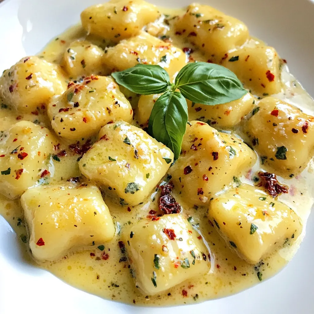 - 1 pound potato gnocchi - 2 tablespoons unsalted butter - 1 tablespoon extra virgin olive oil - 3 cloves garlic, finely minced - 1 cup heavy cream - 1 cup freshly grated Parmesan cheese - 1/2 cup sun-dried tomatoes, roughly chopped - 1/4 teaspoon red pepper flakes (optional) - Salt and freshly ground black pepper to taste - Fresh basil leaves, torn or whole, for garnish You can swap potato gnocchi for gluten-free gnocchi if needed. Use coconut cream in place of heavy cream for a dairy-free option. If you lack sun-dried tomatoes, try roasted red peppers instead. For flavor, you can use a mix of mozzarella and Parmesan cheese. Instead of fresh basil, try parsley or arugula for a different touch. Pair this creamy gnocchi with a crisp Italian white wine like Pinot Grigio. Its bright notes balance the rich sauce well. For a fresh side, serve a simple arugula salad with lemon vinaigrette. The peppery greens will enhance the dish's flavors and add a refreshing contrast. {{ingredient_image_2}} To cook the gnocchi, first, boil a large pot of water. Make sure to add salt to this water. This adds flavor to the gnocchi as they cook. When the water boils, add 1 pound of potato gnocchi. Cook them for about 2-3 minutes. You will know they are ready when they float to the top. Use a slotted spoon to remove them from the pot. Set the gnocchi aside while you prepare the sauce. Now, let’s make the creamy garlic sauce. In a large skillet, melt 2 tablespoons of unsalted butter and add 1 tablespoon of extra virgin olive oil. Heat this mixture over medium heat. Once it is hot, add 3 cloves of finely minced garlic. Sauté the garlic for about 1 minute. You want it to be fragrant and golden but not burned. Next, slowly pour in 1 cup of heavy cream while stirring. Bring this mixture to a gentle simmer, then lower the heat to keep it warm. Time to bring it all together! Gradually whisk in 1 cup of freshly grated Parmesan cheese. Stir until the sauce is smooth and creamy. Then, add 1/2 cup of chopped sun-dried tomatoes and, if you want a spicy kick, include 1/4 teaspoon of red pepper flakes. Let this cook for another 2-3 minutes. After that, gently fold the cooked gnocchi into the sauce. Make sure each piece is well coated. Heat the gnocchi in the sauce for 1-2 minutes. Finally, season with salt and freshly ground black pepper to taste. Serve the gnocchi in warm bowls and garnish with torn basil leaves for a lovely touch. To get a super creamy sauce, use fresh ingredients. Fresh heavy cream whips up better than old cream. Start by melting butter and olive oil over medium heat. This mix adds flavor and helps the sauce stay smooth. Pour in the cream slowly while stirring. This step helps the sauce blend nicely with the garlic. Always keep the heat low once the cream is in. This prevents the sauce from boiling and curdling. A few mistakes can ruin your sauce. Do not rush the garlic. If it burns, it turns bitter. Make sure to whisk in the cheese slowly. Adding it all at once can lead to lumps. If your sauce seems too thick, add a splash of water or more cream. Taste your dish often. Adjust salt and pepper as needed for flavor. To make your sauce extra special, think about adding sun-dried tomatoes. They bring a nice tang and color. Red pepper flakes can add warmth, but only use a little if you want spice. Fresh herbs like basil or parsley give a fresh taste. You could also use a splash of lemon juice for some zing. These little changes can make your gnocchi shine! Pro Tips Use Fresh Ingredients: Always opt for fresh basil and high-quality Parmesan cheese for the best flavor in your creamy sauce. Perfectly Cooked Gnocchi: Ensure your gnocchi is cooked just until it floats; overcooking can lead to a mushy texture. Adjust the Spice Level: Feel free to customize the amount of red pepper flakes according to your taste; start with a small pinch and add more if desired. Serve Immediately: This dish is best served right after preparing, as the gnocchi can become heavy if left in the sauce too long. {{image_4}} You can change the sauce in this dish to fit your taste. Here are some ideas: - Alfredo Sauce: This rich sauce blends well with the gnocchi. Just add more cream and cheese. - Pesto: A fresh basil pesto gives a vibrant flavor. You can use homemade or store-bought. - Marinara: For a classic taste, try a simple tomato sauce. It's light and pairs nicely. - Brown Butter Sage: This sauce adds a nutty flavor. Just melt butter and cook until it turns golden. If you have dietary needs, don’t worry! You can swap some ingredients: - Gluten-Free Gnocchi: Use gluten-free gnocchi made from rice flour or potatoes. - Dairy-Free Cream: Use coconut cream or almond milk instead of heavy cream. - Vegan Cheese: For a dairy-free option, try nutritional yeast or vegan cheese. - Add Protein: Toss in grilled chicken, shrimp, or mushrooms to make it heartier. You can change this dish with seasonal ingredients. Here are some tasty ideas: - Spring: Add peas or asparagus for a fresh touch. - Summer: Use fresh tomatoes and zucchini for a light summer dish. - Fall: Incorporate roasted butternut squash or mushrooms for a warm flavor. - Winter: Add kale or spinach for extra nutrients and color. These variations keep the dish exciting and cater to your personal taste! Try mixing and matching to find your favorite. To keep your Millionaire Gnocchi fresh, let it cool first. Place the leftovers in an airtight container. Store it in the fridge for up to three days. Make sure to seal it well. This keeps the flavors intact and prevents it from drying out. When you are ready to eat again, reheat gently. Use a skillet over low heat for the best results. Add a splash of cream or a bit of water for moisture. Stir often to avoid burning. This method helps keep the creamy sauce smooth and tasty. If you want to store for longer, freezing is a great option. Freeze the gnocchi and sauce separately. For the gnocchi, place it on a baking sheet first. Once frozen, tr