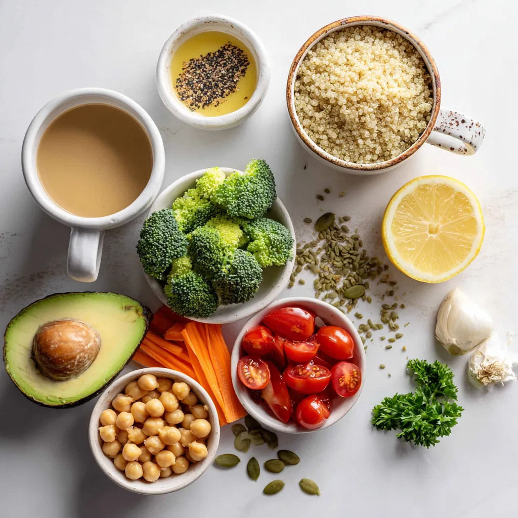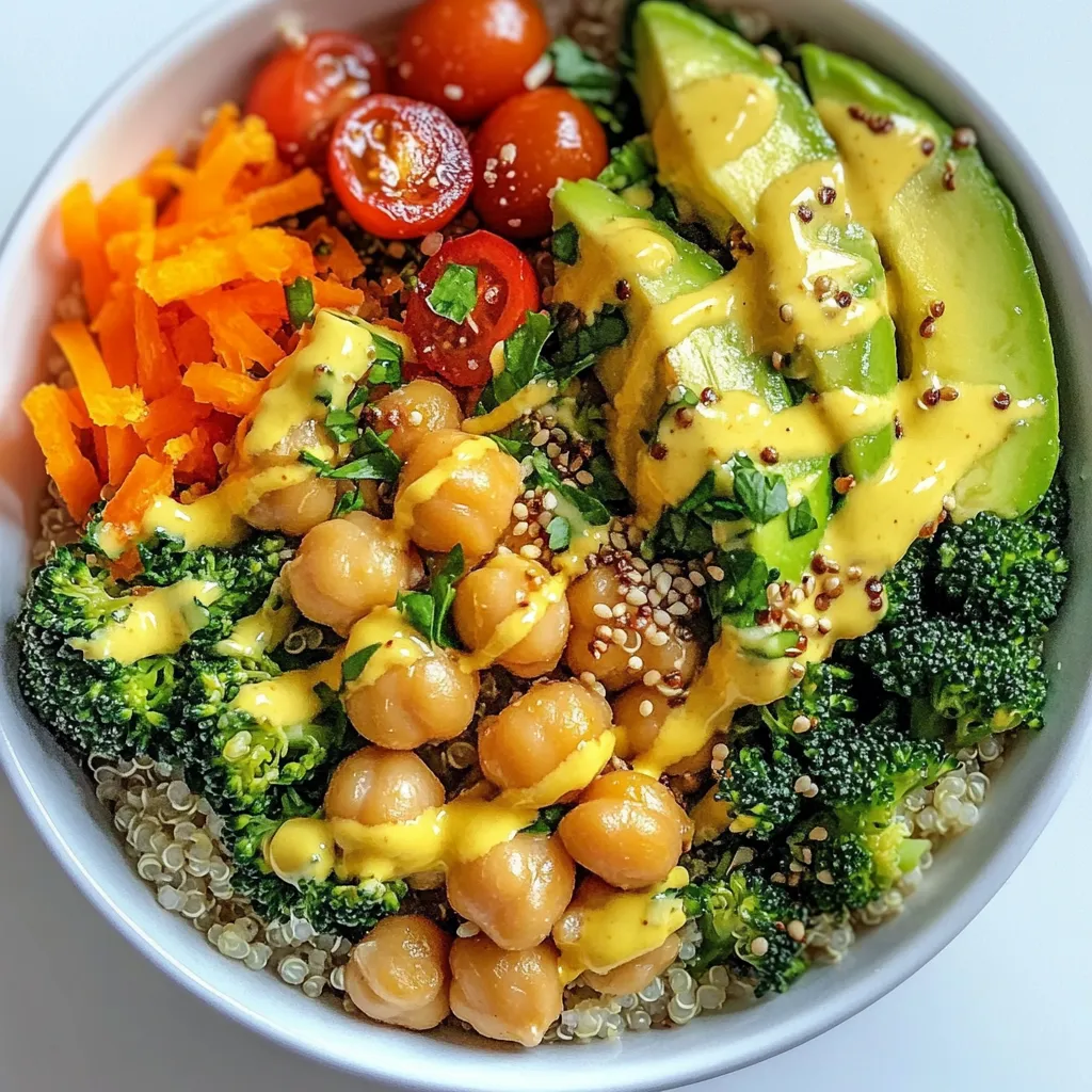 Now it’s time to build your power bowl. In a large serving bowl or individual bowls, start with a layer of fluffy quinoa. This is your base. Next, add cooked chickpeas, steamed broccoli florets, diced avocado, shredded carrots, and halved cherry tomatoes. Be sure to distribute these evenly. Each ingredient brings color and nutrition to the dish. Once everything is layered, drizzle the tahini dressing over the top. This gives a creamy touch. Finally, sprinkle pumpkin seeds for crunch and garnish with chopped parsley. Enjoy the fresh flavors in every bite!
