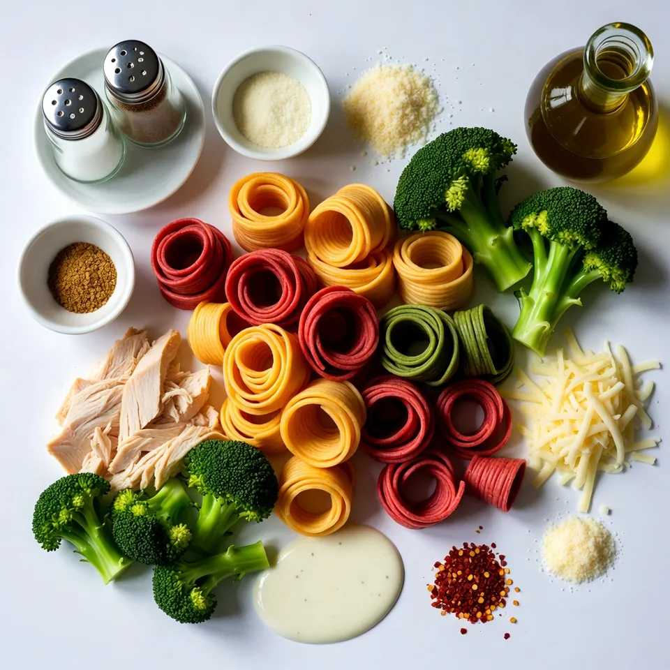 In a large mixing bowl, combine cooked rotini pasta, shredded chicken, and blanched broccoli. Pour in the Alfredo sauce. Add garlic powder, onion powder, and red pepper flakes if you like some heat. Season with salt and pepper. Mix everything well until coated.