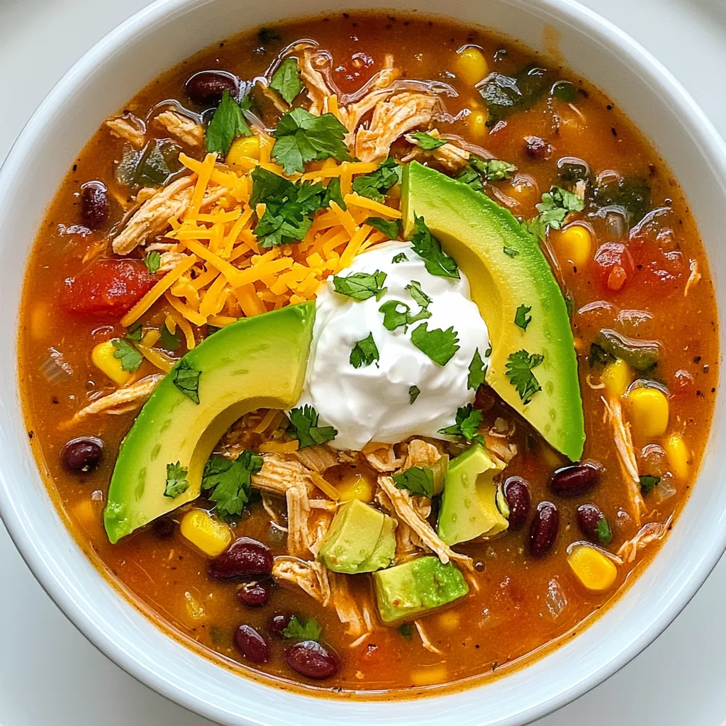 - 1 pound boneless, skinless chicken breasts - 1 can (15 oz) black beans, rinsed and drained - 1 can (15 oz) kidney beans, rinsed and drained - 1 can (15 oz) corn, drained - 1 can (14.5 oz) diced tomatoes with green chilies You need chicken breasts for a rich base. Beans add protein and fiber. Corn gives a sweet crunch, while tomatoes bring acidity and flavor. - 1 packet taco seasoning (about 1 oz) - 4 cups chicken broth - 1 small onion, finely diced - 2 cloves garlic, minced - 1 red bell pepper, diced The taco seasoning gives the soup its signature taste. Chicken broth adds depth and warmth. Onions, garlic, and bell peppers add layers of flavor. - Diced avocado - Shredded cheese - Sour cream - Fresh cilantro - Tortilla chips Toppings let you customize each bowl. Avocado adds creaminess, cheese gives richness, and sour cream offers tang. Fresh cilantro brightens the dish, while chips provide crunch. {{ingredient_image_2}} 1. Cook the onions and bell pepper: Start with a large pot. Heat one tablespoon of olive oil over medium heat. Add one small, finely diced onion and one diced red bell pepper. Cook for about five minutes. Stir often until the onions turn clear and the peppers soften. 2. Adding garlic for flavor enhancement: Mince two cloves of garlic. Add the garlic to the pot. Sauté for one more minute. You want the garlic to smell good but not burn. 1. Incorporate taco seasoning: Grab one packet of taco seasoning. Sprinkle it over the cooked vegetables. Stir well to coat the veggies. This helps release all those great flavors. 2. Mix in chicken and canned items: Add one pound of boneless, skinless chicken breasts. Then, mix in one can of rinsed black beans, one can of rinsed kidney beans, one can of drained corn, and one can of diced tomatoes with green chilies. Pour in four cups of chicken broth. Stir everything well to blend the flavors. 1. Simmering the soup to cook chicken: Turn up the heat to bring the soup to a gentle boil. Once it starts bubbling, lower the heat. Cover the pot and let it simmer for 20 to 25 minutes. This cooks the chicken until it's tender. 2. Shredding chicken and final adjustments: Carefully take the cooked chicken out of the pot. Place it on a cutting board. Use two forks to shred it into small pieces. Return the shredded chicken to the pot and stir well. Taste the soup. Add salt and pepper as needed. If you like it spicy, add more taco seasoning or some crushed red pepper flakes. To make the best chicken taco soup, adjust the seasoning to fit your taste. Start with the recommended taco seasoning, but feel free to add more if you like it spicier. If you want extra heat, add crushed red pepper flakes or fresh jalapeños. These small changes can transform your soup into a dish that excites your palate. You can easily adapt this recipe to a pressure cooker or slow cooker. For a pressure cooker, cook on high for about 10 minutes. If using a slow cooker, let it cook on low for 6-8 hours. Both methods will give you tender chicken and rich flavors. To make this soup in advance, prepare it, then cool it completely. Store it in the fridge for up to three days or freeze it for later. The right toppings can elevate your chicken taco soup. Diced avocado adds creaminess, while shredded cheese gives a rich flavor. A dollop of sour cream adds a nice tang. Fresh cilantro brightens the taste and looks great on top. Pair the soup with crunchy tortilla chips or a fresh salad for a well-rounded meal. Enjoy customizing each bowl to your liking! Pro Tips Use Bone-In Chicken: For a richer flavor, consider using bone-in chicken thighs instead of breasts. They add depth to the soup and remain tender when cooked. Customize Your Spice Level: If you prefer a spicier soup, add diced jalapeños or a few dashes of hot sauce during the cooking process. Make It Ahead: This soup tastes even better the next day! Store leftovers in the fridge for easy reheating and enjoy the enhanced flavors. Add Fresh Herbs: Enhance the flavor by adding fresh herbs like cilantro or parsley just before serving for a burst of freshness. {{image_4}} You can easily switch up the meat in this soup. Using ground chicken or turkey works well. These options cook faster and add a different texture. If you want a meat-free meal, try plant-based proteins. Options like lentils or chickpeas provide great flavor. They also add protein and fiber. Experiment with different spice blends to enhance the taste. Smoked paprika or cumin can add depth. Feel free to add more vegetables too! Zucchini and corn pair nicely with the existing ingredients. You can also toss in bell peppers of different colors for a vibrant look. For a creamy texture, add cheese or cream. Cream cheese stirred in at the end gives a rich flavor. You can also make the soup more like chili. Add extra beans and reduce the broth. This change creates a hearty meal perfect for cooler nights. Store your chicken taco soup in an airtight container. This keeps it fresh and tasty. Leftovers can last in the fridge for about three to four days. Make sure to cool it down before putting it away. For long-term storage, freezing the soup is a great option. Use freezer-safe bags or containers. Remove as much air as you can to prevent freezer burn. Your soup can last in the freezer for up to three months. When ready to eat, thaw it in the fridge overnight. Reheat it on the stove or microwave until hot. This helps keep the flavor and texture nice. Batch cooking this soup is smart for busy nights. Make a big pot and save some for later. Portion it into single servings for quick meals. You can easily grab a container from the fridge or freezer. This makes weeknight dinners a breeze and keeps meals fun and varied. Chicken taco soup lasts about 3 to 4 days in the fridge. Store it in an airtight container. Make sure to cool it down before sealing. If you want it to last longer, freeze it. In the freezer, it can last up to 3 months. Just remember to label the container with the date