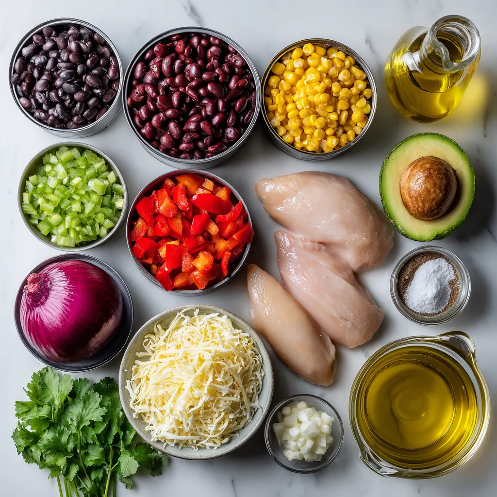 You need chicken breasts for a rich base. Beans add protein and fiber. Corn gives a sweet crunch, while tomatoes bring acidity and flavor.