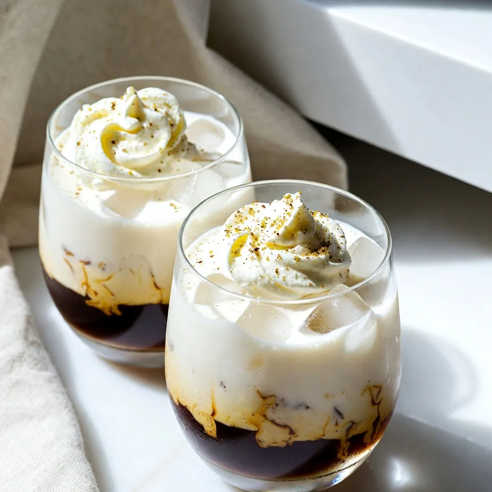 – Pour the coffee mixture evenly into the glasses. Each glass gets half of the coffee mix. This keeps the drink nice and cold.