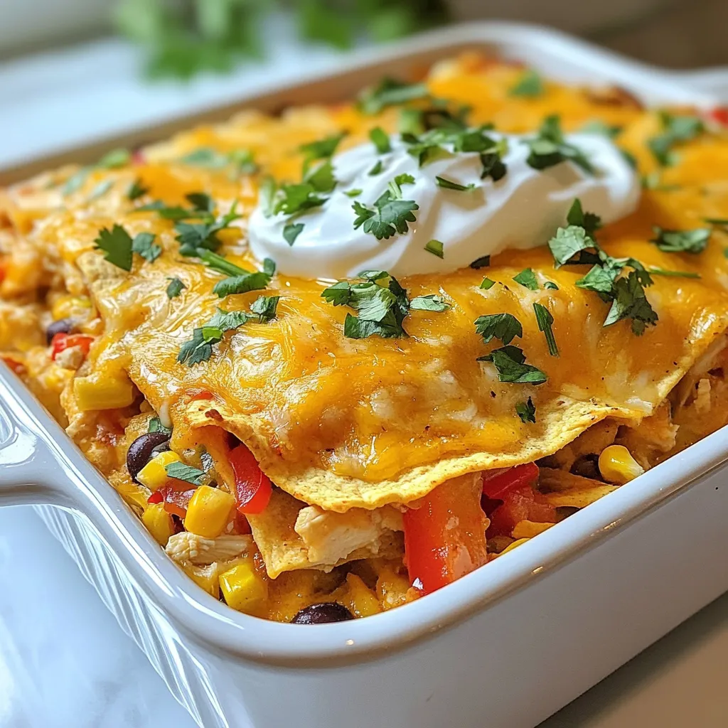 Now, it’s time to mix everything. In a big bowl, combine the chicken, bell pepper, onion, corn, black beans, salsa, chili powder, cumin, and half the cheddar cheese. Add salt and pepper to taste. Mix well so all the flavors blend. Next, grease a 9×13 inch dish. Lay half of the tortilla strips at the bottom. Spoon half of the chicken mixture on top. Repeat with another layer of strips and the remaining chicken mix. Finish with the rest of the tortilla strips, dollop sour cream on top, and sprinkle the remaining cheese.