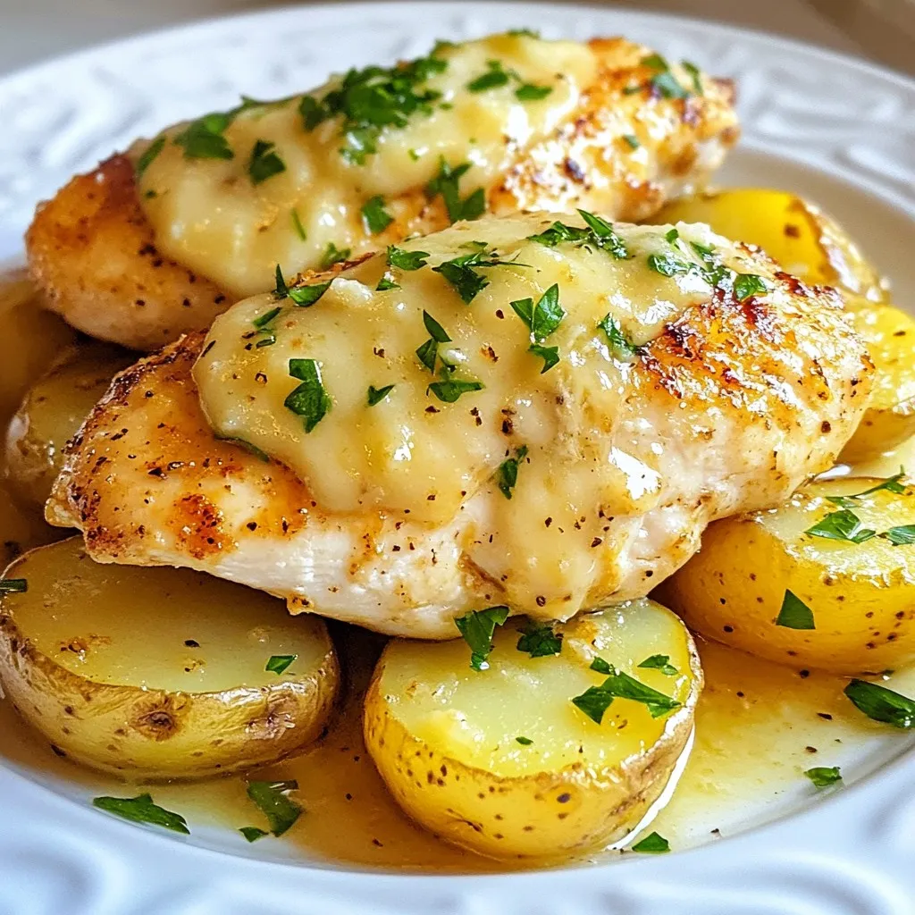 When serving, arrange the chicken and potatoes on a platter. Drizzle that luscious garlic Parmesan sauce on top and sprinkle with fresh parsley for a pop of color. Enjoy every bite!