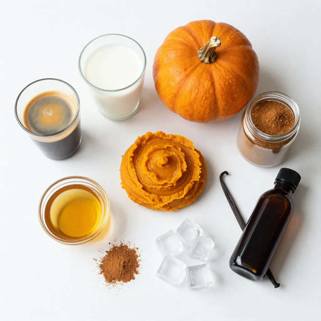 To make an Iced Pumpkin Spice Latte, gather these fresh ingredients. Start with 1 cup of espresso or strong coffee that you chilled. This will be the base of your drink.