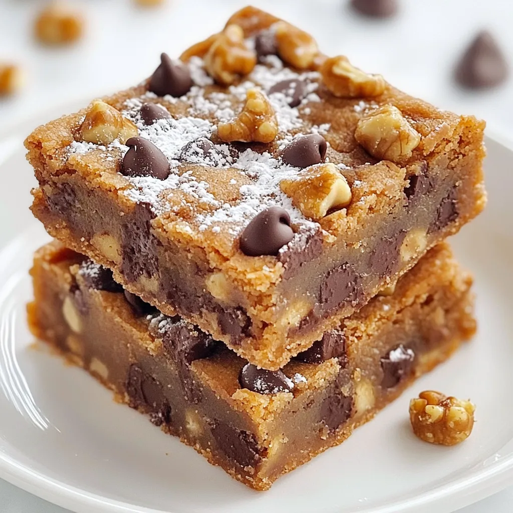 - 1 cup unsalted butter, softened to room temperature - 1 cup packed brown sugar - 1/2 cup granulated sugar - 2 large eggs, at room temperature - 2 teaspoons pure vanilla extract - 3 cups all-purpose flour - 1 teaspoon baking soda - 1/2 teaspoon fine sea salt - 2 cups semi-sweet chocolate chips - 1/2 cup chopped walnuts (optional, for a delightful crunch) To make these melt-in-your-mouth chocolate chip cookie bars, you need simple yet essential ingredients. First, unsalted butter creates a rich base. Use brown sugar for moisture and sweetness. Granulated sugar adds a nice crunch. With eggs and vanilla, you get a delightful flavor. Next, you need all-purpose flour, which gives the bars structure. Baking soda helps them rise and become soft. Sea salt balances sweetness and enhances flavor. Finally, the chocolate chips bring that gooey goodness. If you like a bit of crunch, toss in some chopped walnuts. Gather these ingredients before starting. This way, you’ll have everything ready to go. You’ll enjoy the process and the tasty results! {{ingredient_image_2}} Set your oven to 350°F (175°C). Grab a 9x13-inch baking pan. Lightly grease it with butter or use parchment paper. This helps the cookie bars come out easily. In a large mixing bowl, mix 1 cup of softened butter with 1 cup of packed brown sugar and 1/2 cup of granulated sugar. Use an electric mixer on medium speed. Beat until it looks light and fluffy, about 2-3 minutes. Now, add 2 large eggs, one at a time, to the butter-sugar mix. Beat well after each egg. Next, pour in 2 teaspoons of pure vanilla extract and mix it until smooth. In a separate bowl, whisk together 3 cups of all-purpose flour, 1 teaspoon of baking soda, and 1/2 teaspoon of fine sea salt. Gradually add this dry mix to the wet ingredients. Mix gently with a spatula or wooden spoon until just combined. Be careful not to over-mix! Add 2 cups of semi-sweet chocolate chips to the dough. If you like, add 1/2 cup of chopped walnuts for some crunch. Gently fold these into the dough until evenly mixed. Transfer the cookie dough into your prepared baking pan. Use a spatula to spread it evenly. Place the pan in the oven and bake for 25-30 minutes. Look for golden edges and check with a toothpick; it should come out with a few moist crumbs. Once baked, let the cookie bars cool in the pan for about 10 minutes. Carefully remove them and place them on a wire rack to cool completely. After they cool, cut them into squares or rectangles. Enjoy this melt-in-your-mouth treat! Creaming the butter and sugars is key. You want the mix to be light and fluffy. This step helps to trap air, which makes the cookie bars rise. Use softened, unsalted butter for the best results. Beat the butter with both sugars for about 2-3 minutes. The color should lighten as you mix. This shows you’ve done it right. You need to be gentle when mixing wet and dry ingredients. After you add the flour, baking soda, and salt, mix just until combined. Over-mixing can make the cookie bars tough. Use a spatula or wooden spoon. Fold in the chocolate chips and walnuts carefully. This keeps the dough soft and chewy. Checking doneness is simple. Bake your bars for 25-30 minutes. Look for golden edges. Insert a toothpick in the center. It should come out with moist crumbs, not wet batter. If you see wet batter, they need more time. Remember, they will continue to cook a bit after you take them out. This helps keep them soft and delicious. Pro Tips Room Temperature Ingredients: Ensure your eggs and butter are at room temperature for better incorporation and a smoother dough. Don’t Overmix: Mix the dry ingredients into the wet just until combined. Overmixing can result in tough cookie bars. Check for Doneness: Use a toothpick to check for doneness; it should come out with a few moist crumbs, not wet batter. Storage Tips: Store cookie bars in an airtight container at room temperature for up to a week, or freeze for longer shelf life. {{image_4}} To make these cookie bars nut-free, simply skip the walnuts. This change keeps the bars soft and tasty without any crunch. You still get the melt-in-your-mouth goodness from the chocolate. If you want a bit more texture, try adding oats. Just use 1/2 cup of rolled oats in place of the walnuts. This keeps it nut-free and adds a nice chew. You can change up the chocolate in these bars! Use any type you like. For a sweeter taste, use milk chocolate chips. Dark chocolate gives a deeper flavor and is less sweet. If you want something creamy, go for white chocolate chips. Feel free to mix different types of chocolate too. This way, you create your own unique flavor blend. Want to add a twist? You can mix in spices or extracts. A touch of cinnamon gives warmth and a hint of spice. Try adding 1 teaspoon of cinnamon to the dough. Almond extract adds a rich flavor. Use 1 teaspoon instead of vanilla. You can even add a pinch of sea salt for extra depth. These small changes can make your cookie bars even more special! To keep your cookie bars fresh, store them in an airtight container. Place parchment paper between layers to prevent sticking. This keeps them soft and tasty. If you prefer a crispy edge, store them uncovered. To freeze your cookie bars, let them cool completely. Cut them into squares before freezing. Wrap each piece tightly in plastic wrap. Place them in a freezer bag or container. Thaw them at room temperature for about one hour, or microwave for a few seconds. These cookie bars stay fresh for up to one week at room temperature. If you store them in the fridge, they can last about two weeks. Freezing extends their life to about three months. Enjoy them whenever you want a sweet treat! Yes, you can use margarine in place of butter. Margarine works well in baking. It adds moisture and fat to your cookie bars. However, the taste may change slightly. Butter gives a rich flavor that many love. If you want the best taste, stick with real butter. To check if your cookie bars are d