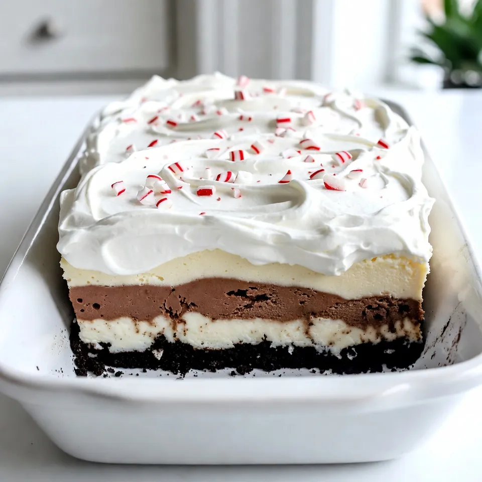 To make your No-Bake Christmas Oreo Lasagna, gather these ingredients: - 2 packs of Oreo cookies (about 36 cookies) - 1/2 cup unsalted butter, melted - 2 cups cream cheese, softened - 1 cup powdered sugar - 2 cups Cool Whip (whipped topping) - 1 teaspoon vanilla extract - 1 cup milk - 1 box (3.9 oz) instant chocolate pudding mix - 1 box (3.9 oz) instant vanilla pudding mix - 1/2 cup crushed peppermint candies (for garnish) Each ingredient plays a key role in this dessert. The Oreo cookies form the base, giving a rich chocolate flavor. The melted butter helps bind the cookie crumbs together. Cream cheese adds a creamy layer, while powdered sugar sweetens it up. Cool Whip creates a light and fluffy texture. The vanilla extract enhances the flavor, and milk helps prepare the pudding mixes. The chocolate and vanilla puddings add layers of taste and contrast. Finally, crushed peppermint candies give a festive touch on top. By using high-quality ingredients, you will ensure the best flavor. Always taste as you go! Enjoy the process of making this delightful dessert. {{ingredient_image_2}} To start, you need two packs of Oreo cookies. Place them in a food processor. Pulse the cookies until you get fine crumbs. Next, melt half a cup of unsalted butter. In a bowl, mix the cookie crumbs with the melted butter. It should feel like wet sand. Press this mixture into a 9x13 inch baking dish. Make sure the crust is even and firm. Now, grab two cups of softened cream cheese. Place it in a large bowl. Add one cup of powdered sugar to the cream cheese. Use an electric mixer to blend until smooth. Gently fold in one cup of Cool Whip. Make sure there are no lumps. Spread this cream cheese mix over your Oreo crust. For the pudding layers, you need chocolate and vanilla pudding mixes. In two bowls, prepare each pudding as the package says. Use two cups of milk for each flavor. Stir until combined. Let it sit for a few minutes to thicken. Once ready, pour the chocolate pudding over the cream cheese layer. Then, add the vanilla pudding on top. Take the remaining Cool Whip and spread it over the pudding layers. Use a spatula to make it smooth and even. This will create a nice finish for your dessert. Now, cover the baking dish with plastic wrap. Place it in the fridge. Let it chill for at least four hours. This helps the layers set well. Before serving, sprinkle crushed peppermint candies on top. This adds a festive touch. Cut the dessert into squares and serve it to your guests. Enjoy the smiles! To make a great Oreo crust, start with good quality Oreos. Use a food processor to crush them into fine crumbs. Mix these crumbs with melted butter. It should feel like wet sand. Press this mix firmly into the bottom of your baking dish. Make sure it is even. This helps the crust hold together well. For the cream cheese layer, use softened cream cheese. This makes it easy to mix. Combine it with powdered sugar in a bowl. Beat it until smooth and creamy. Then, fold in Cool Whip gently. This keeps the mix light and fluffy. Spread this layer evenly over the crust. It adds a rich taste to your dessert. When making the pudding layers, follow the package directions. Use cold milk for both chocolate and vanilla puddings. Stir until mixed and let them sit. This helps them thicken. Carefully pour the chocolate pudding over the cream cheese layer. Then, add the vanilla pudding on top. This creates a lovely, layered look. To add a festive touch, sprinkle crushed peppermint candies on top. This gives a great crunch and flavor. You can also use extra Cool Whip for a nice finish. For a special touch, serve each piece on holiday plates. Add a sprig of mint or a mini candy cane beside each slice. This makes your dessert look even more inviting. Pro Tips Use Fresh Ingredients: Always use fresh cream cheese and Cool Whip for the best texture and flavor in your lasagna. Chill Time is Key: Allow the lasagna to chill for a full 4 hours or overnight for the layers to set perfectly. Customizable Flavors: Experiment with different flavors of pudding or add layers of fruit for a unique twist on this classic dessert. Presentation Matters: Use a sharp knife for clean cuts and serve on festive plates to elevate your dessert's appearance. {{image_4}} You can change the cookies in this Oreo lasagna. Try using mint Oreos for a fresh twist. Golden Oreos can give a lighter flavor. You could even use gluten-free Oreos to fit your needs. Each type will change the taste and fun of this dessert. While chocolate and vanilla are classic, feel free to mix it up! Try butterscotch pudding for a sweet layer. Strawberry pudding can add a fruity touch. You can even use cookies and cream pudding for extra Oreo flavor. Each option offers a new and exciting taste in every bite. To make this dessert vegan, swap cream cheese for vegan cream cheese. Use coconut whipped cream instead of Cool Whip. Choose gluten-free Oreos to keep it safe for gluten-free eaters. With these changes, everyone can enjoy this festive treat! To keep your No-Bake Christmas Oreo Lasagna fresh, cover it tightly. Use plastic wrap or foil to seal the dish. Place it in the fridge. This dessert lasts for about 3 to 4 days. If you notice any change in texture or smell, it's best to toss it. Freezing this dessert is also possible. First, cut it into squares. Wrap each piece in plastic wrap. Then place them in an airtight container. This way, they won't get freezer burn. You can freeze the lasagna for up to 2 months. When you're ready to eat, let it thaw in the fridge overnight. This dessert is best served cold, so reheating is not needed. If you prefer it slightly soft, let it sit at room temperature for about 10 to 15 minutes. This will help it become creamy again without losing its charm. Enjoy each delightful bite! You can store No-Bake Christmas Oreo Lasagna in the fridge for up to 5 days. Just make sure it is covered well with plastic wrap. This keeps it fresh and tasty. The layers stay firm and 
