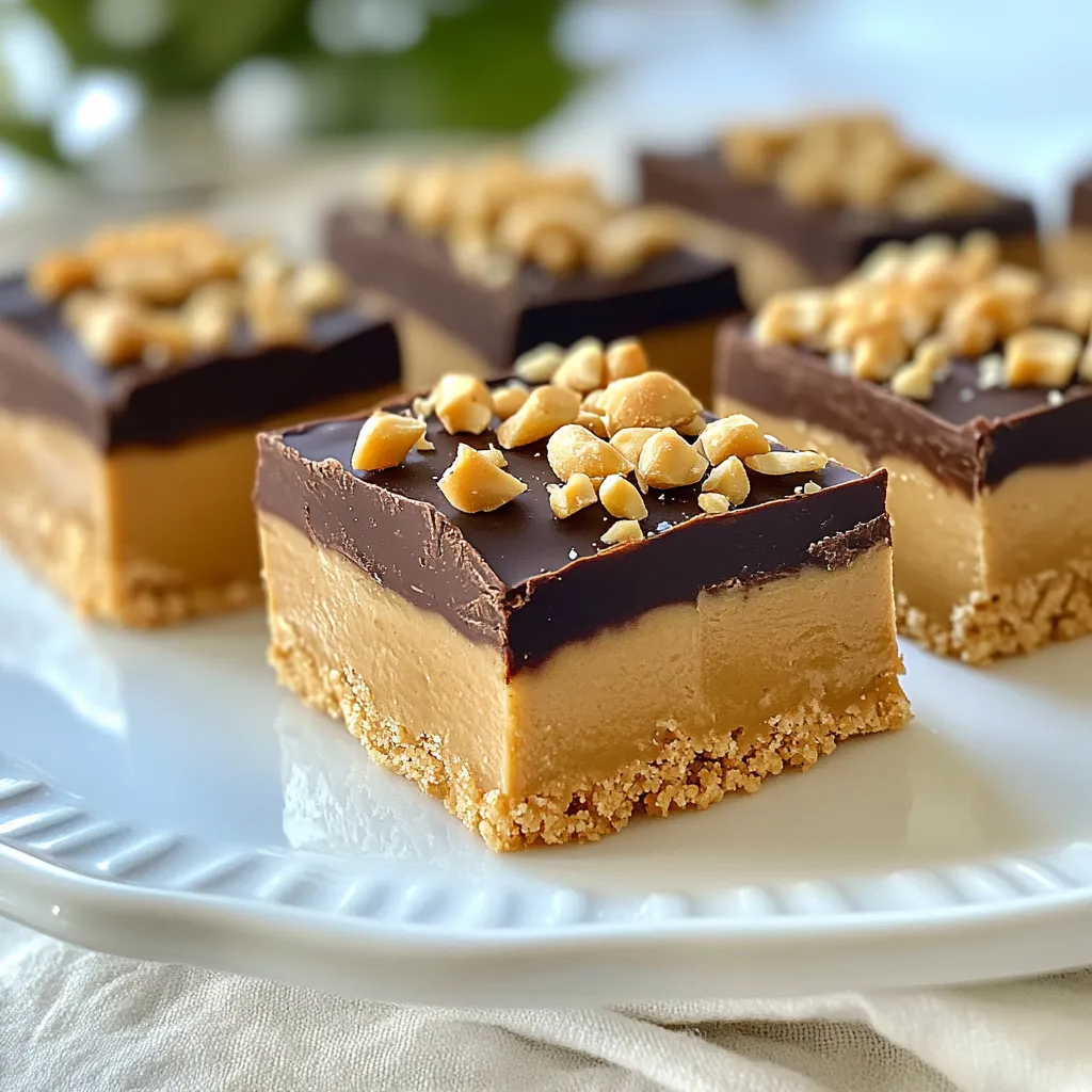 - 1 cup creamy peanut butter - 1 cup rolled oats - 1/2 cup honey or maple syrup - 1/2 cup powdered sugar - 1 teaspoon vanilla extract - 1/4 teaspoon salt - 1/2 cup dark chocolate chips These ingredients come together to make a rich, tasty treat. The creamy peanut butter gives these bars their great flavor. Rolled oats add texture and a bit of healthy fiber. Honey or maple syrup sweetens the mix and keeps everything together. Powdered sugar helps to thicken the bars and adds extra sweetness. Vanilla extract adds a lovely aroma, while salt balances the flavors. Dark chocolate chips on top make every bite a delight. - Alternatives for peanut butter: You can try almond butter or sun butter if you have nut allergies. - Sweetener options: Agave syrup or brown rice syrup can replace honey or maple syrup. - Dairy-free chocolate choices: Use dairy-free chocolate chips if you want to make this treat vegan. These options can help you customize the bars to fit your needs or preferences. Feel free to experiment and find your favorite combination! {{ingredient_image_2}} To start, gather your ingredients. In a large bowl, add 1 cup of creamy peanut butter, 1/2 cup of honey or maple syrup, 1 teaspoon of vanilla extract, and 1/4 teaspoon of salt. Mix these together with a spatula until smooth. Make sure there are no lumps. This step is key for a creamy texture. Next, slowly add 1 cup of rolled oats and 1/2 cup of powdered sugar. Stir them in carefully. Keep mixing until the dough feels thick and well combined. This should take a few minutes. You want it to hold together well. Now, prepare an 8x8 inch baking pan. Line it with parchment paper. Make sure to leave some paper hanging over the edges. This will help you lift the bars out later. Using clean hands or a spatula, press the peanut butter mixture into the bottom of the lined pan. Smooth the surface so it is level. This helps the bars cook evenly. Next, it’s time to melt the chocolate. Place 1/2 cup of dark chocolate chips in a microwave-safe bowl. Microwave in 30-second bursts, stirring each time. This prevents the chocolate from burning. You want it to be fully melted and smooth. Once melted, carefully pour the chocolate over the peanut butter layer. Use a spatula to spread it evenly. This gives a nice finish to your bars. Now, place the pan in the refrigerator. Chill for at least 1-2 hours. This time helps the bars set well. When they are firm, use the parchment paper to lift them out of the pan. Cut into squares or rectangles as you like. For a beautiful presentation, arrange the bars on a nice platter. You can sprinkle some crushed peanuts on top and drizzle with extra melted chocolate. Enjoy your delicious no-bake treat! To make your no-bake peanut butter bars a hit, start with a smooth mixture. Mix the peanut butter, honey, vanilla, and salt well. Use a spatula or whisk to blend until it’s lump-free. This ensures a creamy base for your bars. Next, chill your bars properly. After pouring the melted chocolate on top, place the pan in the fridge. Let it chill for at least 1-2 hours. This helps the bars set firmly, making them easy to cut. You can make these bars your own by adding nuts or seeds. Chopped almonds or sunflower seeds add crunch and nutrition. Feel free to mix in some dried fruit for a sweet touch. Another option is to incorporate protein powder. This will boost the protein content and make your bars more filling. Just mix in a scoop with the oats and sugar. To take your bars to the next level, try adding spices or extracts. A pinch of cinnamon or a drop of almond extract can enhance the flavor. You can also get creative with toppings. Try drizzling extra melted chocolate over the top. Or sprinkle some sea salt for a sweet and salty combo. These little touches can make your bars even more special. Pro Tips Storage Solution: Keep the bars in an airtight container in the refrigerator for up to a week for maximum freshness. Nut Butter Swap: Feel free to use almond or cashew butter instead of peanut butter for a different flavor profile. Chocolate Variety: Experiment with different types of chocolate, such as milk chocolate or white chocolate, for a unique twist. Sweetness Adjustment: Adjust the amount of honey or maple syrup to your taste preference; you can reduce it for a less sweet version. {{image_4}} You can easily make these no bake peanut butter bars even more exciting. One fun way is to add chocolate chips. Just mix in half a cup of dark chocolate chips into your peanut butter mix. This simple step gives a rich chocolate flavor with each bite. Another great option is the peanut butter and banana bars. To create this, add mashed bananas to your peanut butter mixture. This gives a sweet and fruity twist to the bars. The banana flavor pairs well with the creamy peanut butter. If you want to make vegan no bake bars, it’s simple. Use maple syrup instead of honey. Ensure you pick dairy-free chocolate chips. This keeps the bars tasty and suitable for everyone. For gluten-free adaptations, use certified gluten-free oats. This small change allows those with gluten issues to enjoy these bars without worry. They will still taste just as good! These bars are great on their own but can be even better with sides. Try pairing them with fresh fruits like strawberries or bananas. The juicy fruits balance the sweetness of the bars. You can also serve them on a dessert platter. Arrange the bars nicely and add some yogurt dips on the side. This makes for a colorful and fun dessert spread that everyone will love! For your No Bake Peanut Butter Bars, use airtight containers. They help keep the bars fresh. If you don't have one, parchment paper works too. Just wrap the bars tightly. This method keeps them from drying out. Store your bars in the fridge for the best taste. The cool temperature helps them stay firm. You can also freeze them for longer storage. If you freeze them, they can last for months. Just remember to let them thaw before you eat