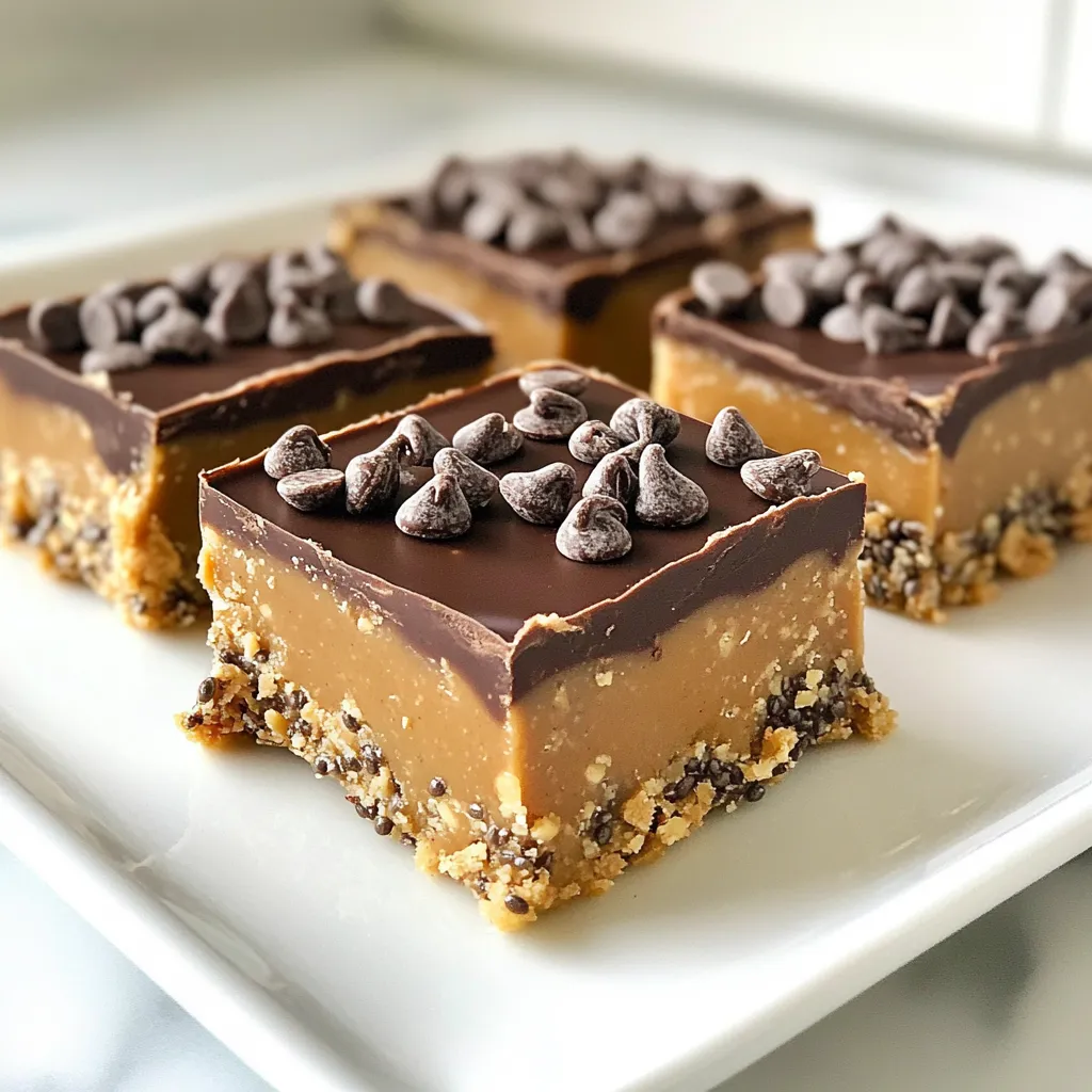 To make these scrumptious no bake peanut butter bars, gather these simple ingredients: - 1 cup natural peanut butter (creamy or crunchy) - 1 cup rolled oats - 1/2 cup honey or maple syrup - 1/2 cup dark chocolate chips - 1/4 cup powdered sugar (optional for extra sweetness) - 1/4 cup chia seeds (optional for texture and nutrition) - A pinch of fine sea salt - 1 teaspoon vanilla extract Each ingredient plays a key role in flavor and texture. - Peanut Butter: This gives the bars their rich, nutty taste. - Oats: They provide a hearty base and chewy consistency. - Honey or Maple Syrup: These sweeteners bind the bars and add sweetness. - Chocolate Chips: They create a delicious topping that melts beautifully. - Powdered Sugar: This is optional, but it can make the bars sweeter. - Chia Seeds: These add crunch and boost nutrition. - Sea Salt: A pinch enhances all the flavors. - Vanilla Extract: This adds a warm, sweet aroma. Feel free to customize! You can swap the sweeteners or add dried fruits for new flavors. {{ingredient_image_2}} First, grab a large mixing bowl. Add 1 cup of natural peanut butter. You can choose creamy or crunchy, based on what you like. Next, pour in 1/2 cup of honey or maple syrup. Add 1 teaspoon of vanilla extract for flavor. Use a spatula or wooden spoon to mix this blend until it looks smooth and creamy. Now, take a medium bowl and add 1 cup of rolled oats. If you want extra sweetness, add 1/4 cup of powdered sugar. For some nutrition, toss in 1/4 cup of chia seeds. Then, sprinkle in a pinch of fine sea salt. Stir these dry ingredients well to mix them evenly. Gradually add the dry oat mixture to the peanut butter mix. Stir vigorously until it all comes together. You want a sticky, cohesive dough that holds well. Now, line an 8x8 inch baking dish with parchment paper. Make sure the paper hangs over the sides. This helps with easy removal later. Pour the combined mixture into the lined dish. Use your spatula to spread it evenly. Press the mixture down firmly into the bottom. Next, take 1/2 cup of dark chocolate chips and place them in a microwave-safe bowl. Melt them in the microwave. Heat in 20-second intervals, stirring in between. Stop when the chocolate is fully melted and smooth. Drizzle this melted chocolate over the pressed peanut butter mixture. Use your spatula to spread it evenly. Now, place the baking dish in the refrigerator. Let it chill for at least 1-2 hours. This helps the bars firm up nicely. Once set, carefully lift the bars out by the parchment overhang. Place them on a cutting board. Cut into squares or bars as you like. Enjoy your delicious no bake peanut butter bars! Choosing between creamy or crunchy peanut butter is key. Creamy peanut butter gives a smooth, rich taste. Crunchy peanut butter adds fun bites and texture. Pick what you love! Pressing the mixture tightly is also crucial. This helps the bars hold together. Use a spatula to really pack it down. The tighter you press, the better they stay firm. You can boost the flavor with extra goodies. Try adding mini chocolate chips, dried fruit, or nuts for added crunch. These mix-ins make the bars even more fun and tasty. Melting chocolate can be tricky. Use short bursts in the microwave. Heat for 20 seconds, then stir. Repeat until it’s smooth. This way, you avoid burning the chocolate. For a great look, arrange the bars on a wooden board. Garnish with extra chocolate chips or chia seeds on top. This makes your dessert pop with color! Pair these bars with fresh fruit or yogurt. Slices of banana or strawberries go well. They add a nice, fresh touch and make your plate more inviting. Pro Tips Choose Your Peanut Butter Wisely: Opt for natural peanut butter without added sugars or oils for a healthier option. The flavor and texture will significantly enhance your bars! Experiment with Sweeteners: Feel free to adjust the sweetness by using more or less honey or maple syrup. You can also try agave nectar or coconut nectar for a different flavor profile. Chill for Perfect Texture: Make sure to let the bars chill in the refrigerator for at least 1-2 hours. This helps them firm up nicely and makes cutting easier. Add Variety with Mix-ins: Customize your bars by adding ingredients like dried fruits, nuts, or seeds for extra flavor and nutrition. Just be mindful of the ratios to keep the bars cohesive. {{image_4}} You can make these peanut butter bars even healthier. One way is to swap refined sugars for natural sweeteners. Natural sweeteners like honey or maple syrup add flavor and nutrients. They also keep the bars moist. If you want a lower glycemic index, use agave nectar. Another great option is to substitute with different nut butters. Almond butter, cashew butter, or sunflower seed butter work well. Each nut butter gives a unique taste and texture. Try them out and see which one you like best! If you want to change the flavor, adding cocoa powder is a great idea. Just a few tablespoons can turn these bars into a chocolate treat. You could also try cinnamon or nutmeg for a warm spice flavor. These additions make your bars more exciting. You can also include dried fruits or nuts. Chopped dates, cranberries, or raisins add sweetness and texture. Nuts like walnuts or almonds give a nice crunch. Mix and match to find your favorite combo! To keep your no bake peanut butter bars fresh, use an airtight container. You can stack the bars with parchment paper between layers to prevent sticking. Store them in the refrigerator at a cool temperature. They will stay fresh for up to one week. For longer shelf life, you can freeze these bars. Wrap each bar in plastic wrap, then place them in a freezer-safe bag. This way, they won’t get freezer burn. They can last for up to three months in the freezer. When you're ready to enjoy a bar, take it out and let it thaw in the fridge for a few hours. This helps maintain the creamy texture. If you need it fast, you can let it sit at room temperature for about 30 minutes. 