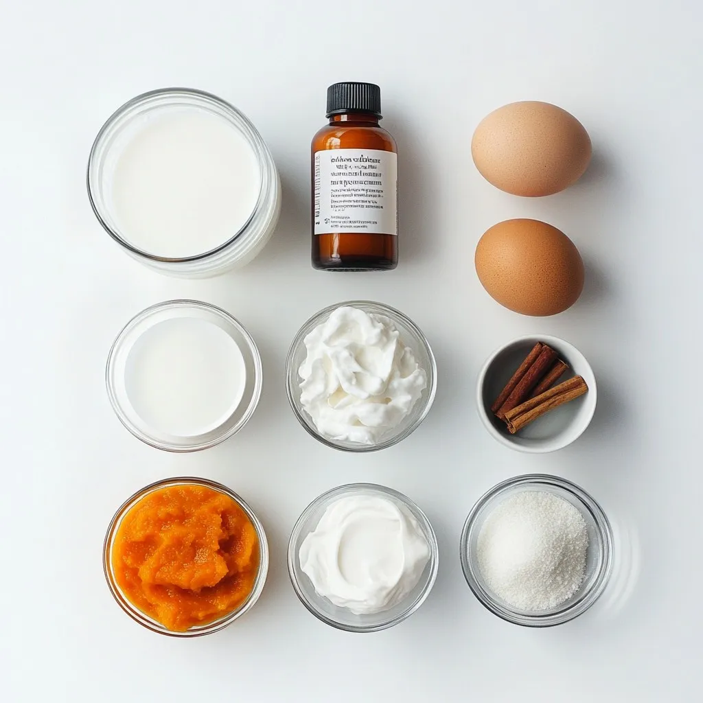 For this pumpkin spice eggnog, you need simple, fresh ingredients. Whole milk and heavy cream create a rich base. Pumpkin puree adds that smooth, earthy flavor. Granulated sugar sweetens the drink, while large eggs give it a creamy texture.