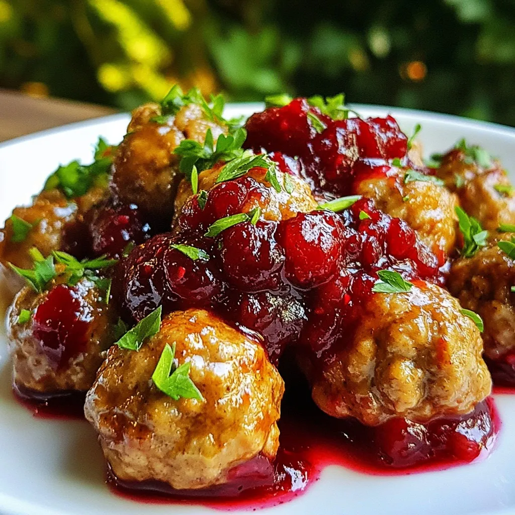 To make quick cranberry meatballs, gather these ingredients: - 1 pound ground turkey or beef - 1 cup fresh cranberries or 1 cup canned cranberry sauce - 1/2 cup breadcrumbs - 1/4 cup finely chopped onion - 1/4 cup finely chopped fresh parsley - 1 large egg - 2 tablespoons soy sauce - 1 tablespoon hoisin sauce - 1/2 teaspoon garlic powder - Salt and pepper to taste - 1 tablespoon olive oil for sautéing These ingredients create a perfect blend of flavors. Ground turkey or beef serves as the base. I love using fresh cranberries, but canned sauce works too. Breadcrumbs add texture, while onion and parsley give freshness. The egg acts as a binder, keeping everything together. Soy and hoisin sauces add depth and sweetness. Garlic powder, salt, and pepper round out the taste. Finally, olive oil helps achieve a nice golden color when frying the meatballs. Having everything ready before you start makes cooking easier. This way, you can focus on mixing and cooking without rushing. Enjoy the process, and feel free to get creative with the ingredients! {{ingredient_image_2}} 1. Preheat your oven to 400°F (200°C). This helps the meatballs cook evenly. 2. Line a baking sheet with parchment paper. It makes cleanup easy. 3. In a large bowl, mix together the ground turkey or beef, breadcrumbs, chopped onion, parsley, egg, soy sauce, hoisin sauce, garlic powder, and a pinch of salt and pepper. Use your hands or a spoon to blend these well. 4. Shape the mixture into small meatballs, about 1 inch in size. Place them on the baking sheet with space between each one. 1. Heat olive oil in a skillet over medium heat. 2. When the oil is hot, add meatballs in small batches. Sear them for 5-6 minutes, turning often, until they are brown all over. 3. For the cranberry sauce, if you use fresh cranberries, combine them with a splash of water in a small pot. Cook over medium heat for about 10 minutes until they burst. If you prefer canned, just warm it on low heat for a few minutes, stirring now and then. 1. Once the meatballs are brown, place the baking sheet in the oven. Bake for 10-12 minutes until cooked through. The inside should reach 165°F (75°C). 2. After baking, take the meatballs out of the oven. Pour the cranberry sauce over them. Let them simmer in the sauce for 2-3 minutes. This helps mix the flavors and gives a nice glaze. 3. Serve the meatballs warm. You can sprinkle more chopped parsley on top for a fresh look. Enjoy! To get the best texture, you need to control moisture. Adding breadcrumbs helps absorb excess liquid. Start with 1/2 cup of breadcrumbs. If your mixture feels too wet, add more breadcrumbs, a tablespoon at a time. This will help form meatballs that hold together well. Cooking meatballs evenly is key to a great dish. Make sure they are all the same size, about 1 inch in diameter. This way, they cook at the same rate. If you crowd them in the pan, they will steam instead of brown. Cook in small batches for best results. Seasoning can elevate your meatballs. Besides salt and pepper, consider adding spices like paprika or cumin for warmth. Fresh herbs, like basil or thyme, can also add a nice touch. Add-ins are a fun way to boost flavor. You can mix in grated cheese, chopped bell peppers, or even finely diced mushrooms. These ingredients add depth and make each bite exciting. For serving, arrange meatballs on a large platter. Drizzle cranberry sauce over them for a bright look. You can also serve them with toothpicks for easy eating. Garnishing adds a pop of color. A sprinkle of fresh parsley on top makes the dish vibrant. You can even add a few whole cranberries for a festive touch. This makes your meatballs not just tasty, but also beautiful! Pro Tips Use Fresh Cranberries for Bold Flavor: Fresh cranberries will provide a tartness that complements the meatballs beautifully. If using canned, opt for a low-sugar option to maintain balance. Don’t Skip the Searing: Searing the meatballs before baking adds a rich depth of flavor and a delightful texture, ensuring they are crispy on the outside and tender inside. Make Ahead for Convenience: You can prepare the meatball mixture and shape them a day in advance. Store them in the fridge, and simply bake when you're ready to serve. Experiment with Sauces: While cranberry sauce is a classic pairing, feel free to try different sauces like BBQ or a sweet chili glaze to give the meatballs a unique twist. {{image_4}} You can switch ground turkey for beef. Both work well in this recipe. If you prefer turkey, it is leaner. Beef adds a richer flavor. You can also change the sauces. Try teriyaki sauce instead of hoisin for a sweet twist. If you want a kick, add chili sauce. Fresh herbs can also change the taste. Use cilantro or basil instead of parsley for a fresh spin. These meatballs can fit many cuisines. For a Mediterranean touch, add oregano and serve with tzatziki. If you want an Asian flair, mix in sesame oil and serve over rice. You can make meatball sliders too. Just place them in small buns and add some sauce. Serve them as appetizers on toothpicks for easy eating. They are perfect for any party or gathering. If you have leftover meatballs, get creative. You can add them to pasta dishes or salads. They also work well in sandwiches. For breakfast, chop them up and mix with eggs. A meatball soup can be a warm, comforting dish. Just add broth and veggies. The options are endless, making these meatballs a great choice for meal prep. To keep your quick cranberry meatballs fresh, follow these tips: - Use airtight containers: Store leftover meatballs in airtight containers. This helps keep them moist. - Refrigeration: Place them in the fridge. They stay good for about 3-4 days. - Freezing: For longer storage, freeze the meatballs. They last up to 3 months. - Label containers: Write the date on each container. This helps you know when to use them. When it's time to enjoy your meatballs again, here’s how to reheat them: - Oven method: Preheat the ove