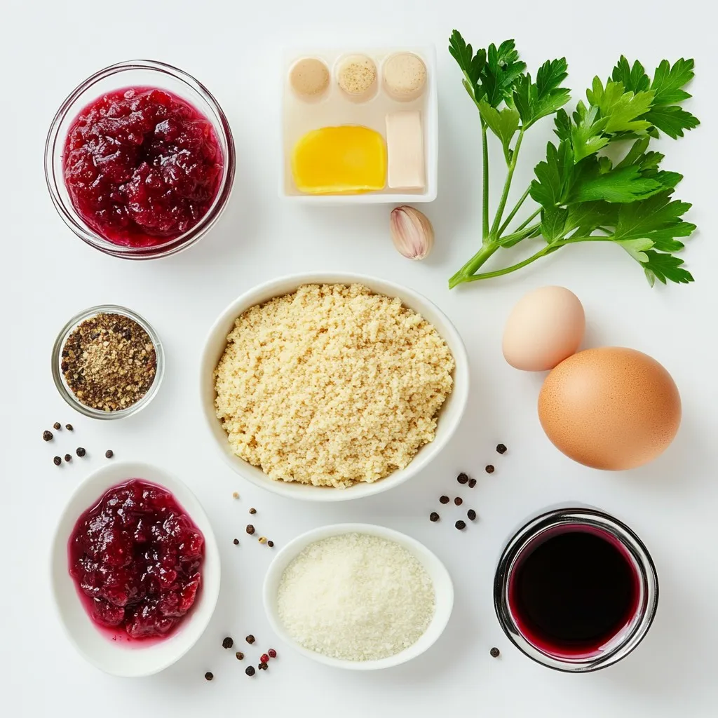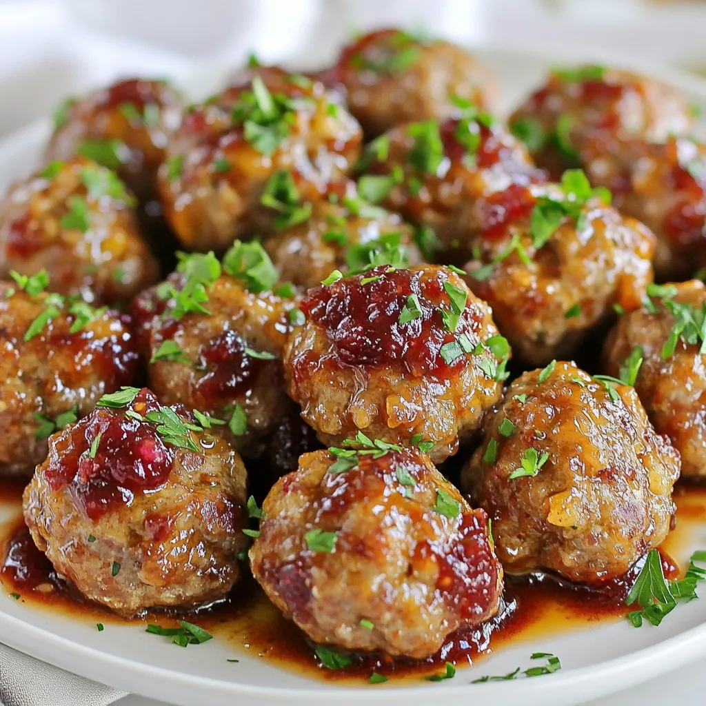 - 1 pound ground turkey or chicken - 1/2 cup breadcrumbs - 1/4 cup grated Parmesan cheese - 1 teaspoon garlic powder - 1 teaspoon onion powder - 1 cup cranberry sauce - 1 tablespoon fresh parsley, finely chopped - Additional seasonings For these quick cranberry meatballs, I use ground turkey or chicken. They both work well and keep the meatballs light. The breadcrumbs help bind the meat together. Grated Parmesan cheese adds a nice, savory flavor. I include garlic powder and onion powder for a boost of flavor. They blend well into the meat mixture. The star of this dish is the cranberry sauce. It brings a sweet and tangy taste that pairs great with the meatballs. If you want to add some freshness, use chopped parsley as a garnish. You can also add other seasonings if you like. This recipe is very flexible! {{ingredient_image_2}} - Preheat the oven to 400°F (200°C). This will ensure the meatballs cook well. - Prepare the baking sheet with parchment paper. This helps keep the meatballs from sticking. - Mix the meatball ingredients in a large bowl. Combine ground turkey, breadcrumbs, Parmesan, egg, garlic powder, onion powder, salt, and black pepper. - Use your hands or a spoon to mix until everything is combined. Be gentle, so the meatballs stay tender. - Roll the mixture into balls about 1 inch in diameter. Place each meatball on the baking sheet, leaving space between them. - Bake the meatballs in the oven for 15-20 minutes. They should be golden brown and reach an internal temperature of 165°F (74°C). - While the meatballs bake, prepare the cranberry sauce. In a medium saucepan, heat cranberry sauce, soy sauce, and Dijon mustard over medium heat. - Stir this mixture often until it heats through, about 5-7 minutes. This sauce will add a sweet and tangy kick to your meatballs. To make meatballs that are soft and juicy, avoid overmixing. Overmixing makes the meat tough. When you mix the ground turkey with the other ingredients, do it gently. Use your hands or a spoon. Combine until just mixed. Choose the right meat for your meatballs. Ground turkey or chicken works well. Use lean meat to keep them light. If you prefer, you can also use ground beef. Just keep in mind it will change the flavor. You can use homemade or store-bought cranberry sauce. Homemade sauce gives you control over flavor. If you choose store-bought, look for one with real fruit. Adjust the sweetness and tanginess to your taste. If you want a sweeter sauce, add more sugar or honey. For a tangier flavor, add a splash of vinegar or lemon juice. This balance makes a big difference. Garnish your meatballs for a nice touch. Finely chop some fresh parsley and sprinkle it on top. You can also add whole cranberries for color. For serving, consider using a decorative platter. You can line it with fresh greens for a pop of color. If you’re hosting, use toothpicks. This makes it easy for guests to grab a meatball. Pro Tips Use Fresh Herbs: Fresh parsley not only enhances the flavor but also adds a vibrant touch to your dish. Consider adding fresh thyme or rosemary for extra depth. Adjust Sweetness: Depending on your taste, you can adjust the sweetness of the cranberry sauce by adding a touch of honey or maple syrup for a richer flavor. Make Ahead: These meatballs can be made ahead of time and frozen. Just bake them, let them cool, and store in an airtight container for up to 3 months. Serve with Sides: Pair these meatballs with creamy mashed potatoes or a fresh salad to create a well-rounded meal that balances flavors and textures. {{image_4}} You can easily change the meat in this recipe. Ground beef or pork works well. If you want a lighter option, use ground turkey or chicken. You can even try plant-based alternatives for a meat-free meal. For the cheese, if you need a dairy-free option, use nutritional yeast or a vegan cheese. This keeps the flavor while making it accessible for everyone. Adding spices can really boost the taste. Try adding a pinch of cayenne for heat or some Italian herbs for a twist. You can also switch up the sauce. Instead of cranberry sauce, use barbecue sauce or sweet chili sauce. Each option brings a new flavor adventure. Experimenting is the key to finding your favorite. If you need gluten-free options, use gluten-free breadcrumbs. Many brands offer great choices that work well. For a low-carb version, try using ground almonds or crushed pork rinds instead of breadcrumbs. This keeps the meatballs tender while cutting down on carbs. These adaptations ensure everyone can enjoy this tasty dish. To store leftovers in the fridge, first let the meatballs cool. Place them in an airtight container. This keeps them fresh and prevents odors. You can keep them in the fridge for up to four days. Be sure to use them within this time for the best taste. To freeze meatballs, let them cool completely. Arrange them in a single layer on a baking sheet. Freeze until firm, about one hour. Then, transfer the meatballs to a freezer-safe bag. They can stay frozen for up to three months. When you want to eat them, thaw overnight in the fridge. Reheat them in the oven at 350°F (175°C) for about 10-15 minutes. In the fridge, these meatballs last up to four days. For the best quality, eat them within this timeframe. If you see any discoloration or off smells, it's time to toss them. Always label containers with the date to keep track of freshness. This will help you enjoy your tasty cranberry meatballs at their best! To check if meatballs are cooked, use a meat thermometer. Insert it into the center of a meatball. The safe internal temperature is 165°F (74°C). If the meatballs reach this temperature, they are done. They should also look golden brown on the outside. Cooking time is usually 15-20 minutes in a preheated oven at 400°F (200°C). Keep an eye on them toward the end of cooking. If you don't have a thermometer, cut one open. The inside should be no longer pink. Yes, you can make these meatballs ahead of time. To 