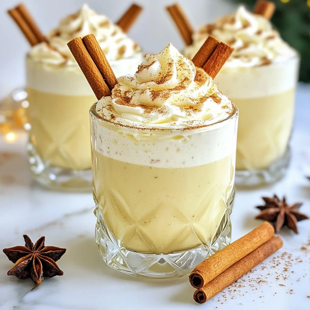 When you’re ready to serve, pour the eggnog into festive glasses. Top it with a generous dollop of whipped cream. Add a cinnamon stick for that perfect touch. Enjoy the warmth and joy of this festive drink!