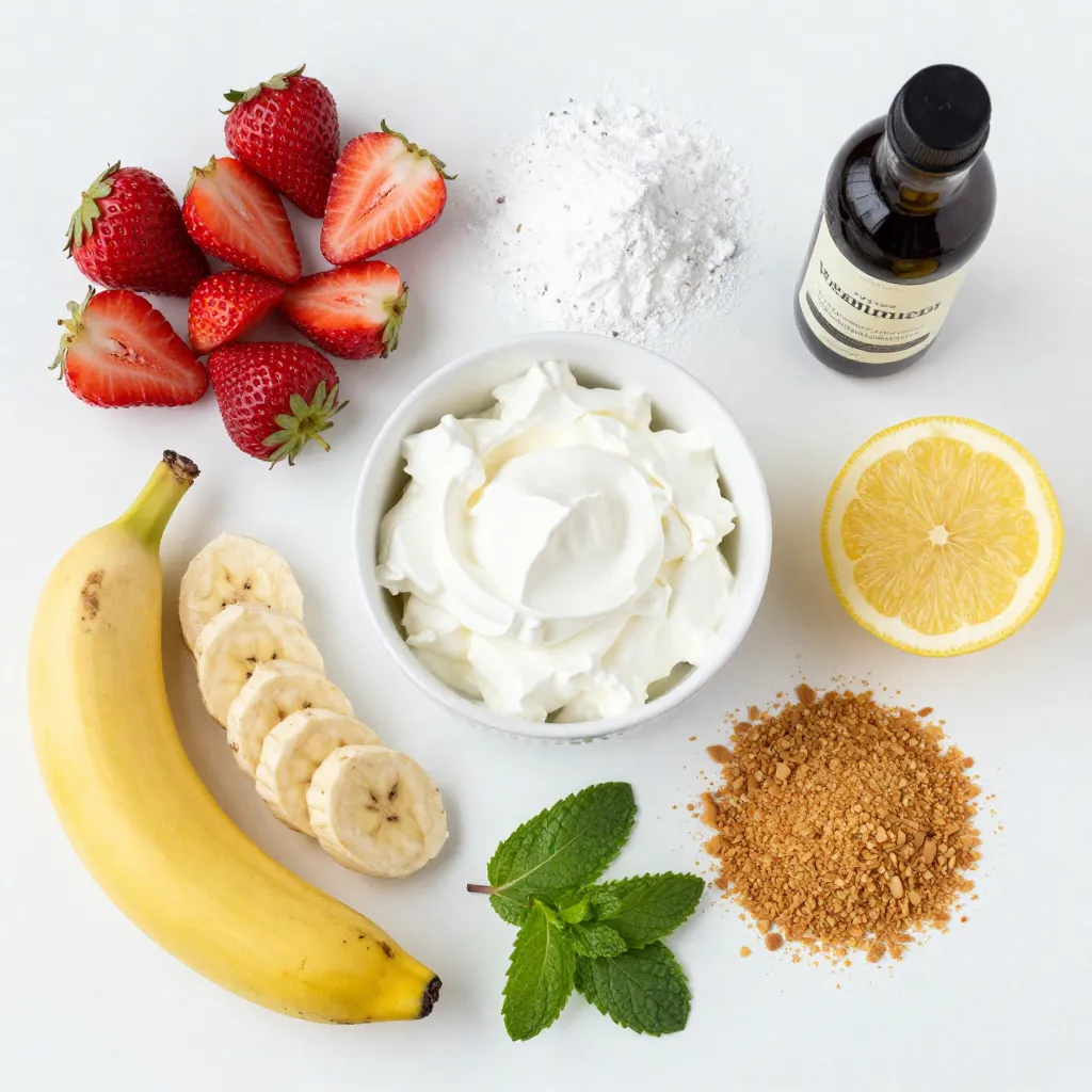 - 2 cups fresh strawberries, hulled and sliced - 2 ripe bananas, sliced - 1 cup cream cheese, softened at room temperature - ½ cup Greek yogurt - ⅓ cup powdered sugar - 1 teaspoon vanilla extract - ½ teaspoon lemon juice - 1 cup graham cracker crumbs - Fresh mint leaves for garnish Fresh ingredients bring life to any dish. For this Strawberry Banana Cheesecake Salad, the choice of fruit matters. You need ripe strawberries and bananas. Strawberries should be bright red and sweet. Bananas should be just ripe, not too soft. This way, they will hold their shape in the salad. The creamy base is key to this salad's charm. First, I use cream cheese for richness. Softening it at room temperature makes mixing easy. Then, I add Greek yogurt for that extra creaminess. This combination works well and tastes great. The powdered sugar adds the right sweetness. Vanilla extract gives a warm flavor. A touch of lemon juice brightens it all up. This creamy mix is smooth and perfect for the fruit. The crunch factor is the final touch. Graham cracker crumbs add texture that contrasts the creaminess. They give a nice crunch. Lastly, fresh mint leaves add a pop of color and a fresh taste. This combination of fresh fruit, creamy base, and crunchy topping makes the salad a delight. Enjoy each bite! {{ingredient_image_2}} Start by gathering your ingredients. In a medium bowl, combine: - 1 cup cream cheese, softened - ½ cup Greek yogurt - ⅓ cup powdered sugar - 1 teaspoon vanilla extract - ½ teaspoon lemon juice Using an electric mixer, blend these ingredients on medium speed. Keep mixing until the mixture is smooth and creamy. You want it lump-free for the best texture. Next, take a large mixing bowl. Gently toss together: - 2 cups fresh strawberries, hulled and sliced - 2 ripe bananas, sliced Be careful while mixing. You want to ensure the fruit is even but avoid bruising the bananas. This step keeps everything looking fresh and vibrant. Now it's time to bring it all together. Carefully pour the creamy mixture over the fruit in the large bowl. Use a spatula to gently fold the mixture into the fruit. Make sure each piece of fruit is well coated in the creamy goodness. Cover the bowl with plastic wrap. Place it in the refrigerator for at least 30 minutes. This time allows the flavors to meld beautifully. Chilling also makes the salad refreshing. When you're ready to serve, sprinkle 1 cup of graham cracker crumbs over the top. This will add a lovely crunch. For an extra touch, garnish with fresh mint leaves. This not only looks great but adds a pop of color and flavor. Enjoy your Strawberry Banana Cheesecake Salad! To make your salad smooth and creamy, start with room-temperature cream cheese. This helps it blend well. Mix it with Greek yogurt, powdered sugar, vanilla, and lemon juice. Use an electric mixer on medium speed until it’s lump-free. When tossing the bananas with strawberries, be gentle. Bananas bruise easily, which can make your salad look messy. Use a light hand to keep the slices intact and fresh. You can adjust the sweetness of your salad by adding more powdered sugar. Taste it as you go. If you want a lighter option, try using honey or agave syrup instead of powdered sugar. This change can add a unique flavor. If you don't have Greek yogurt, you can use sour cream or regular yogurt. Each option will give your salad a creamy base. Just remember, Greek yogurt offers a thicker texture. Serve your Strawberry Banana Cheesecake Salad in clear glass bowls. This will show off the bright colors of the strawberries and bananas. It makes the dish look pretty and tempting. For a pop of color, sprinkle fresh mint leaves on top. They add freshness and a lovely green touch. You can also try adding a few extra graham cracker crumbs for a nice crunch. Pro Tips Choose Ripe Fruits: Use perfectly ripe strawberries and bananas for the best flavor and texture. Overripe fruits can make the salad mushy. Chill Before Serving: Allow the salad to chill for at least 30 minutes. This helps the flavors meld together and enhances the overall taste. Graham Cracker Variations: For a twist, try using flavored graham crackers like cinnamon or chocolate to add a unique touch to your salad. Fresh Mint Garnish: Fresh mint not only adds a pop of color but also complements the flavors of the fruits beautifully. Don’t skip this step! {{image_4}} You can switch up the fruits in this salad. Other berries like blueberries or raspberries add fun flavors. They mix well with the creamy base and give more color. If it's summer, try using peaches. They bring a sweet and juicy twist that pairs nicely with the creaminess. Want a lighter take? You can substitute low-fat cream cheese for regular cream cheese. It keeps the taste but cuts some fat. For sweetness, use honey or agave syrup instead of powdered sugar. This keeps it sweet and adds a touch of natural flavor. Your taste buds will still dance with joy! Add a hint of cinnamon or nutmeg to the creamy mixture. These spices give a warm, cozy feel to the salad. If you like a crunch, mix in some chopped nuts. Walnuts or pecans work great and offer a wonderful texture. Each bite becomes a fun surprise! To store leftovers of your strawberry banana cheesecake salad, first, place it in an airtight container. This keeps out air and moisture, which can spoil the salad. If you have a large batch, consider using smaller containers for easier access. Always use a clean spoon when serving to avoid introducing bacteria. To keep the salad fresh, store it in the refrigerator as soon as you finish eating. This prevents unwanted bacteria growth. Avoid leaving it out for more than two hours. In the refrigerator, your salad will taste best for two to three days. After that, the fruits may start to turn mushy, losing their delightful texture. Watch for signs of spoilage, such as off smells or a change in color. If the strawberries or bananas look brown or slimy, it’s time to toss the salad. Can you freez