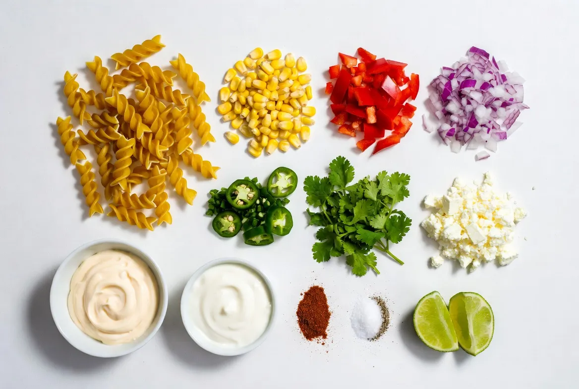 The right ingredients make this Street Corn Pasta Salad shine. Here’s what you will need: