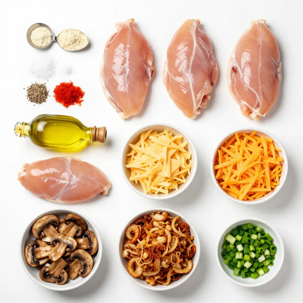 Once the chicken is seared, remove the skillet from the heat. If you like mushrooms, scatter one cup of sautéed mushrooms over the chicken. Next, sprinkle one cup each of shredded Monterey Jack and sharp cheddar cheese on top. Make sure to cover the chicken well for that cheesy goodness. Now, place the skillet in your preheated oven. Bake for 20-25 minutes. Check that the chicken reaches 165°F (75°C) inside. When the cheese has melted and is bubbly, it’s time to take it out. Add half a cup of crispy fried onions on top for a nice crunch. Lastly, sprinkle with a quarter cup of finely chopped green onions before serving. Enjoy the beauty of your creation!