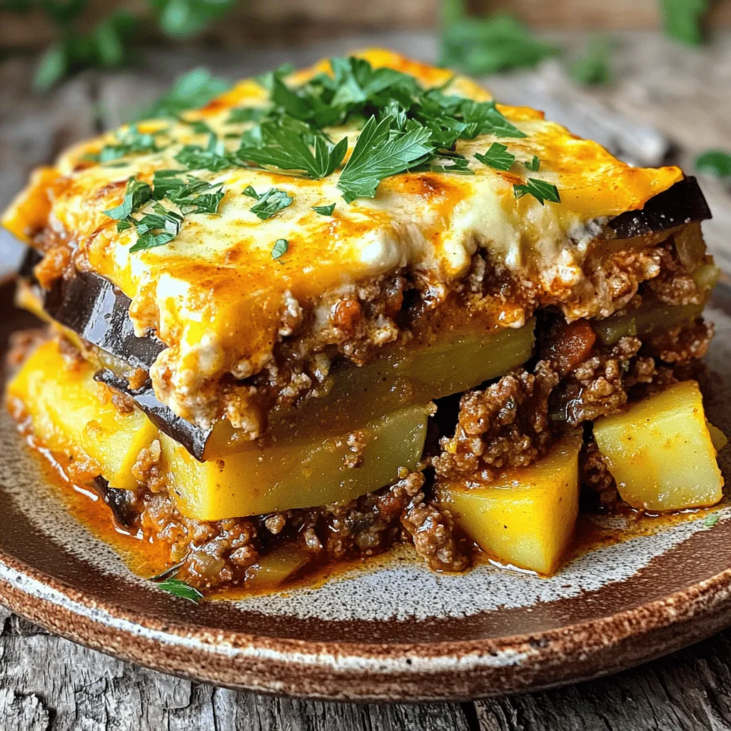 - 3 large eggplants, sliced into 1/4 inch rounds - 1 lb ground beef or lamb - 3 medium potatoes, peeled and sliced into rounds Moussaka starts with the base of sliced eggplants. I prefer large eggplants for their rich flavor. Ground meat, either beef or lamb, adds a hearty touch. Potatoes serve as a sturdy layer, too. - 1 large onion, finely diced - 3 cloves garlic, minced - 1 can crushed tomatoes - 2 tablespoons tomato paste - 1 teaspoon ground cinnamon - 1 teaspoon dried oregano - 1 teaspoon sea salt - 1/2 teaspoon black pepper - 1/4 cup extra virgin olive oil - 1 1/2 cups béchamel sauce - 1/2 cup fresh grated Parmesan cheese - 1/2 cup shredded mozzarella cheese The seasonings make the dish sing. The mix of cinnamon and oregano gives it a warm flavor. The béchamel sauce adds creaminess, while the cheeses bring richness and a nice crust. - Fresh parsley for garnish - Variations for different dietary preferences Feel free to add fresh parsley on top for color. If you want to switch things up, consider using lentils or mushrooms instead of meat. This way, you can cater to different diets while keeping the dish tasty. First, preheat your oven to 375°F (190°C). Slice the eggplants into 1/4 inch rounds. Lay them on a baking sheet and sprinkle salt over each slice. Let them sit for about 30 minutes. This step draws out moisture, making the eggplants less soggy. After 30 minutes, rinse the slices under cold water. Pat them dry with paper towels. This removes excess salt and moisture. Next, fill a pot with water and add a pinch of salt. Bring the water to a boil. Once boiling, add the potato slices. Cook them for about 5-7 minutes. You want them slightly tender but still firm. After cooking, drain the potatoes and set them aside to cool. In a large skillet, heat 2 tablespoons of olive oil over medium heat. Add the diced onion and minced garlic. Sauté them for about 3-4 minutes, until they are soft and fragrant. Next, add 1 pound of ground beef or lamb. Break it apart with a spoon and cook until browned, about 5-7 minutes. After browning the meat, add 1 can of crushed tomatoes, 2 tablespoons of tomato paste, 1 teaspoon of ground cinnamon, 1 teaspoon of dried oregano, 1 teaspoon of sea salt, and 1/2 teaspoon of black pepper. Stir well and let the mixture simmer for 10-15 minutes. This helps the flavors blend nicely. For the béchamel sauce, if you choose to make it from scratch, melt 1/4 cup of butter in a saucepan over medium heat. Whisk in 1/4 cup of flour until you have a smooth paste. Gradually add 2 cups of milk while whisking. Stir until the sauce thickens. Add a pinch of salt and nutmeg for taste. How to prevent sogginess: Sogginess can ruin your moussaka. To avoid this, salt the eggplant slices. Let them sit for about 30 minutes. This draws out excess moisture. Rinse the slices well and pat them dry. This step makes a big difference. Cooking methods for eggplants: You can cook eggplants in different ways. Sautéing gives a nice flavor. Frying adds richness, but be mindful of oil. Baking is a great option, too. It keeps them tender without extra fat. Choose the method that works best for your taste. Best practices for assembly: When layering your moussaka, start with potatoes. This creates a solid base. Next, add half of the meat mixture. Follow with half of the eggplant. Repeat these layers. The last layer should be eggplant. This keeps everything neat and organized. Ensuring even cooking: To ensure even cooking, spread each layer evenly. Use a spatula to smooth out the filling. This helps the heat circulate. It also ensures that every bite has the same great taste. Ideal pairing with salads: Moussaka pairs well with fresh salads. A Greek salad is a perfect choice. The crisp veggies add a nice contrast. The tangy dressing balances the rich flavors of the moussaka. Alternative side dishes: You can serve moussaka with other sides, too. Roasted vegetables or a simple rice dish work well. These options add variety to your meal. Choose sides that you enjoy and that complement the moussaka. {{image_4}} You can easily make moussaka vegetarian. Just swap the meat for lentils or mushrooms. Lentils add protein and a nice texture. Use cooked green or brown lentils for a hearty bite. If you prefer mushrooms, use a mix of button and portobello mushrooms for depth. Sauté them with onions and garlic until soft. This gives your dish a rich flavor without meat. If you need a gluten-free option, try a gluten-free béchamel sauce. Use gluten-free flour or cornstarch to thicken your sauce. You can also use almond or coconut milk for a dairy-free version. Just like the classic sauce, cook it until smooth and thick. This way, you still get that creamy topping without gluten. Moussaka is not the same everywhere in Greece. Each region has its twist. In some areas, they add zucchini or bell peppers. Others use different spices or herbs. For example, in Crete, they may add a layer of béchamel with egg. These changes create unique flavors and textures. Explore different styles to find your favorite! To keep your moussaka fresh, let it cool first. After it cools, cover it tightly with plastic wrap or aluminum foil. You can also use an airtight container. Store it in the fridge for up to three days. Keeping it sealed prevents it from drying out. When you’re ready to eat, just take it out and enjoy! If you want to save moussaka for later, freezing is a great option. Cut it into individual slices for easy serving. Wrap each slice in plastic wrap, then place them in a freezer-safe bag. Make sure to press out any extra air. You can freeze moussaka for up to three months. Label the bag with the date so you know when to use it. To reheat moussaka, avoid the microwave if you can. The oven is best for keeping the texture nice. Preheat your oven to 350°F (175°C). Place the moussaka in an oven-safe dish and cover it with foil. Heat for about 20-30 minutes, or until it’s warm all the way through. If you want a cris